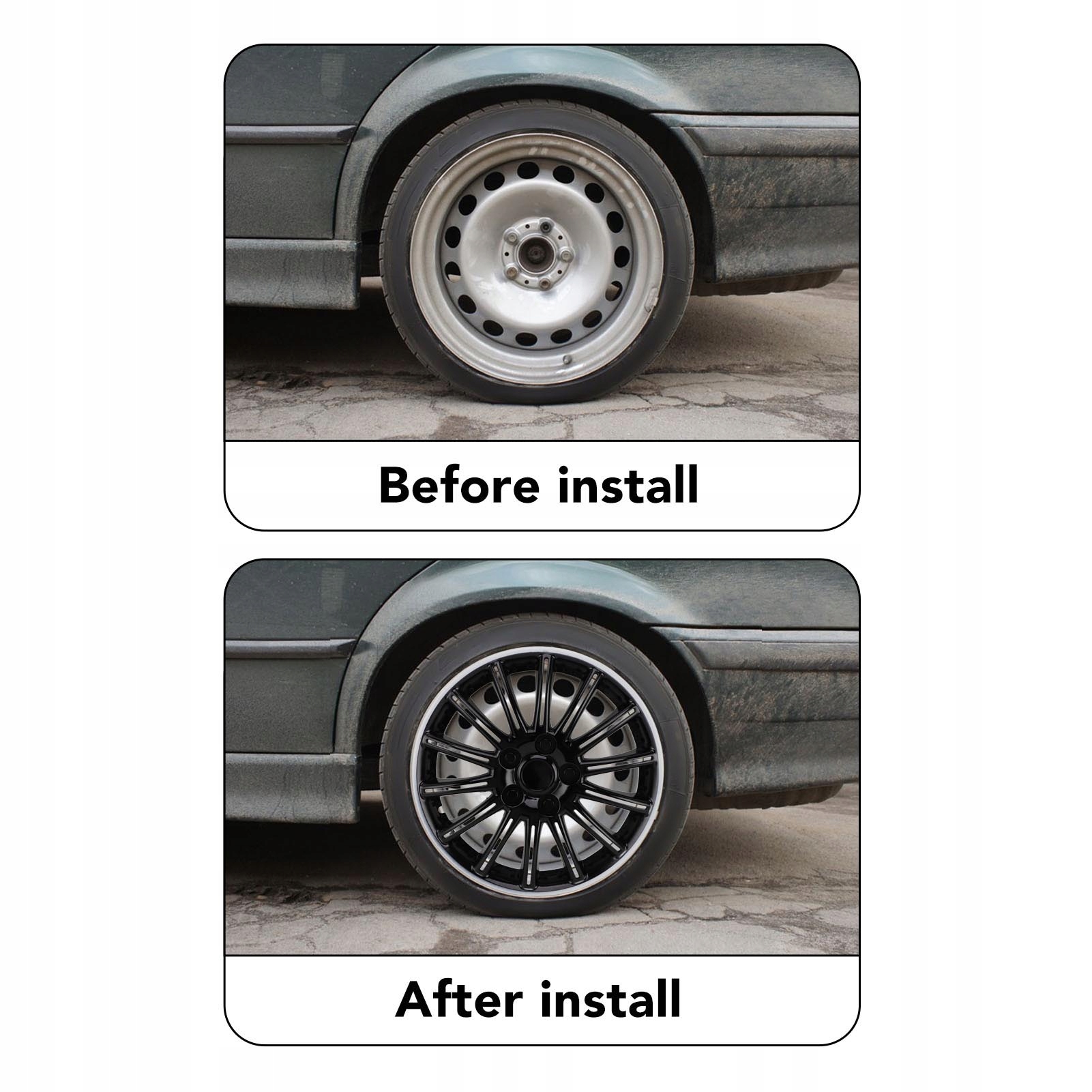 1. Застосовні моделі: захист обода підходить для будь-якого 13-дюймового сталевого колеса (не підходить для алюмінієвих дисків) і більшості легкових автомобілів і фургонів.
