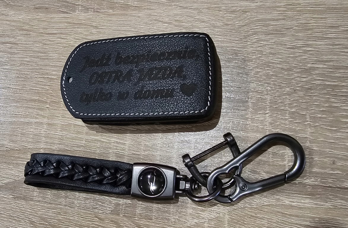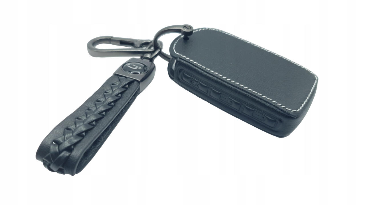 Новий чохол, обкладинка з поліуретанової шкіри з білою окантовкою, з ремінцем і карабіном для моделей smart keyless у чорному варіанті. Можливість гравірування будь-якого тексту чи графіки.