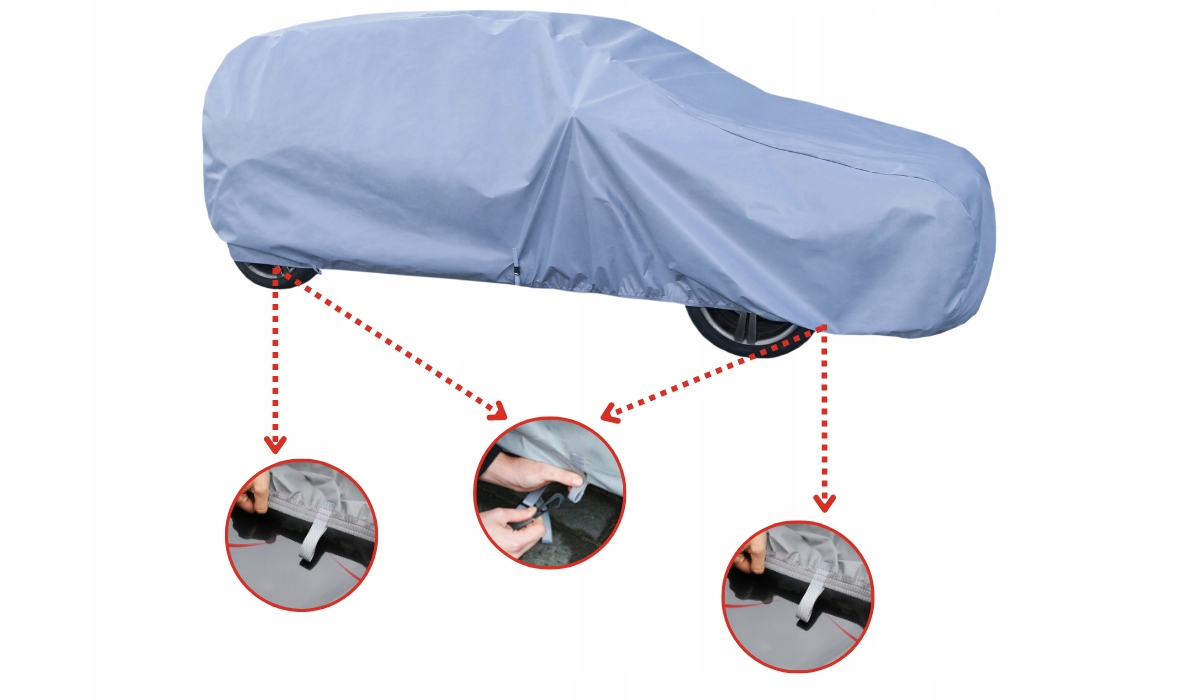 Крім того, чохол оснащений стабілізуючими ременями, розташованими спереду та ззаду автомобіля, які захищають від зриву чохла під час сильного вітру.