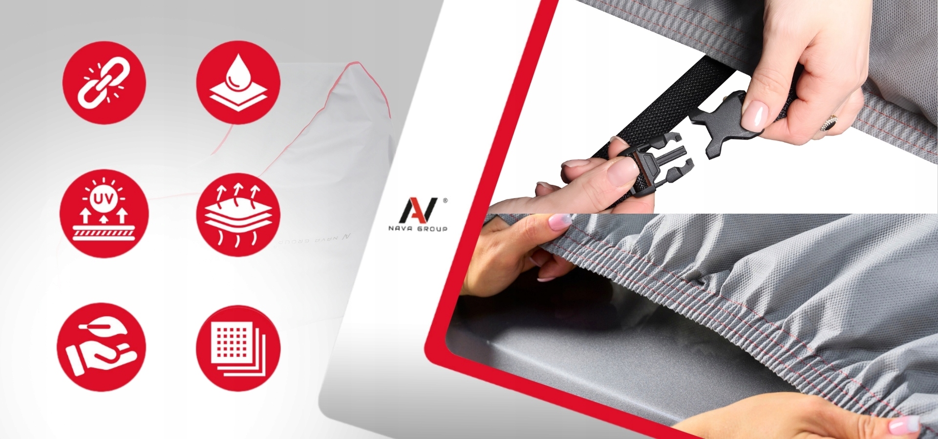Використання тришарового матеріалу спанбонд у верхній частині ефективно захищає від опадів, а бічні сторони, виготовлені з проникного матеріалу, дозволяють водяній парі виходити зсередини чохла. Така комбінація допомагає підтримувати оптимальні умови для зберігання мотоцикла незалежно від погоди.