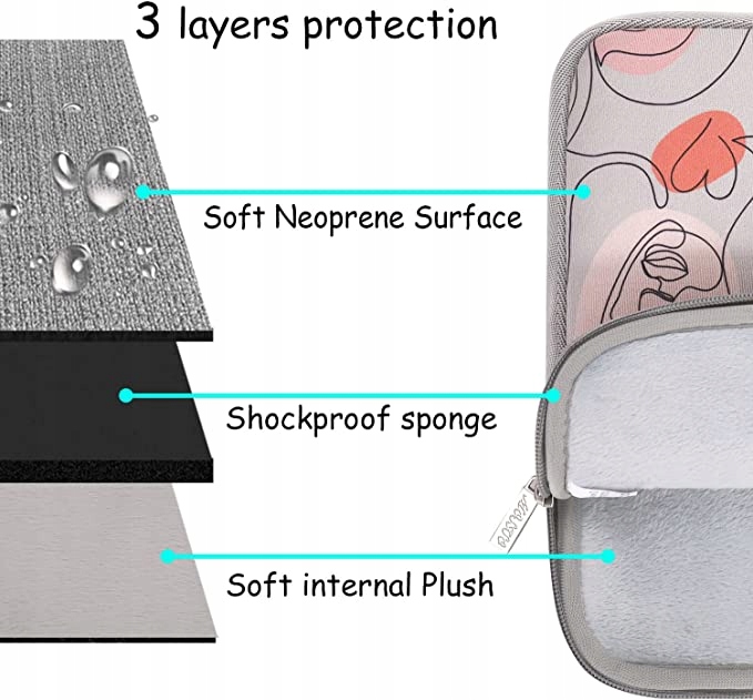 - Він оснащено шаром неопренової піни та пухнастою нетканою підкладкою для поглинання ударів і ударів і захисту комп’ютера від випадкових подряпин.