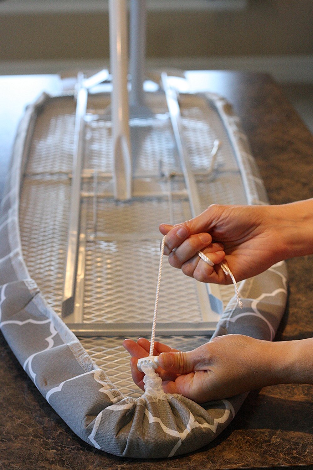 Ілюстровані інструкції щодо одягання чохла на прасувальну дошку.