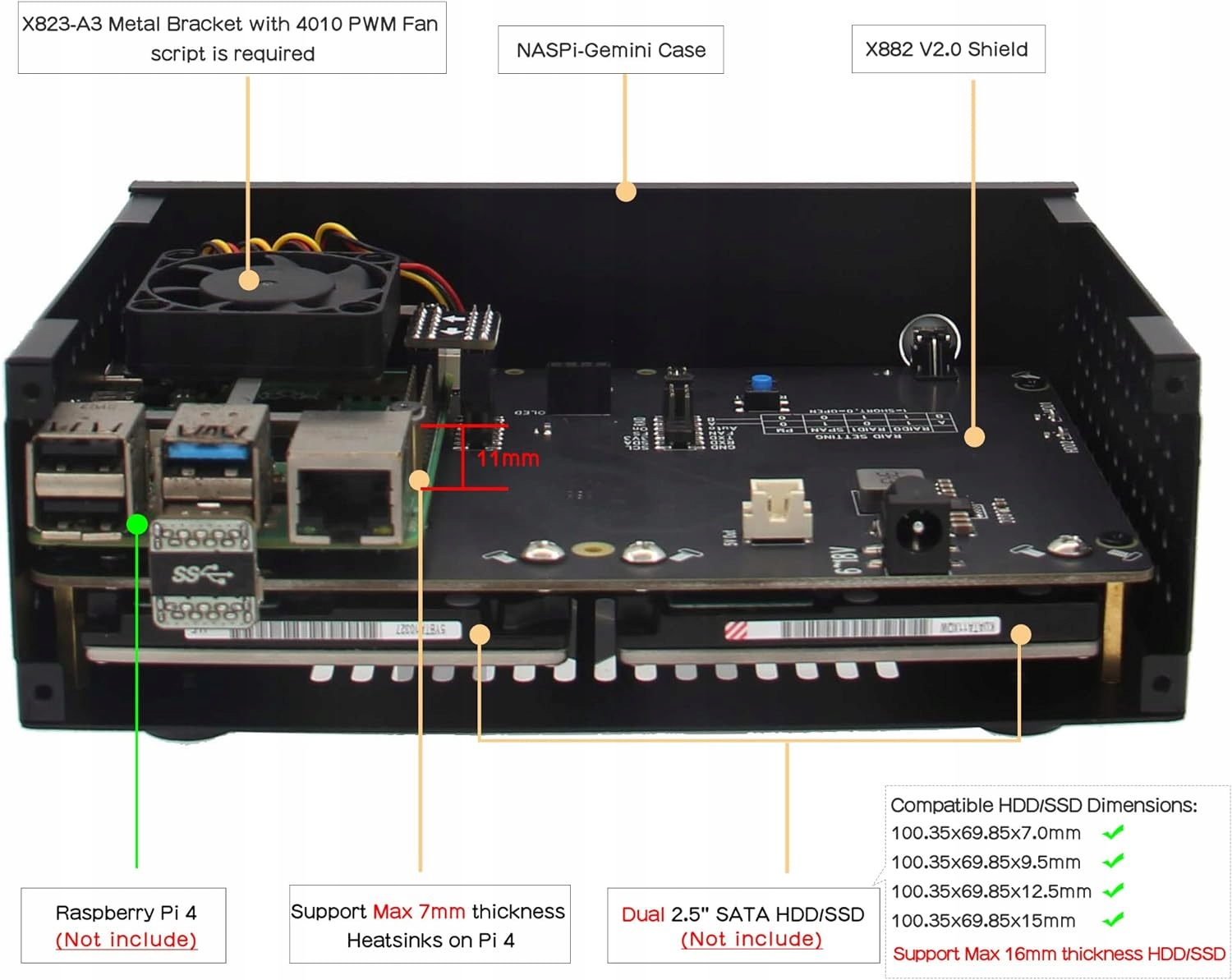 - 1 × X882 V2.0 Dual 2.5'' SATA HDD Shield