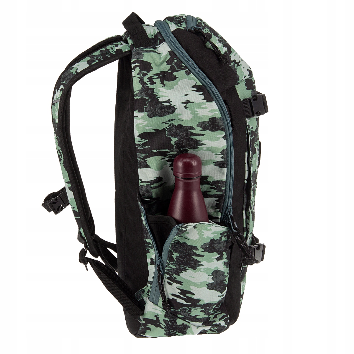 - Пляшка з водою зручно поміщається в бічній сітчастій кишені