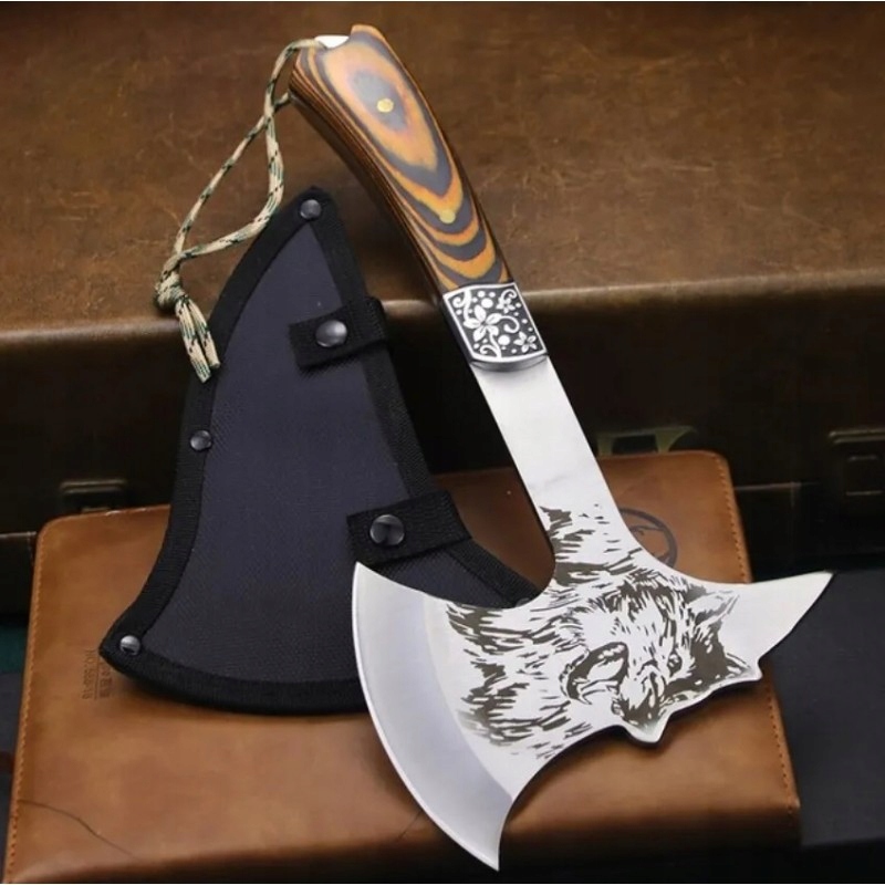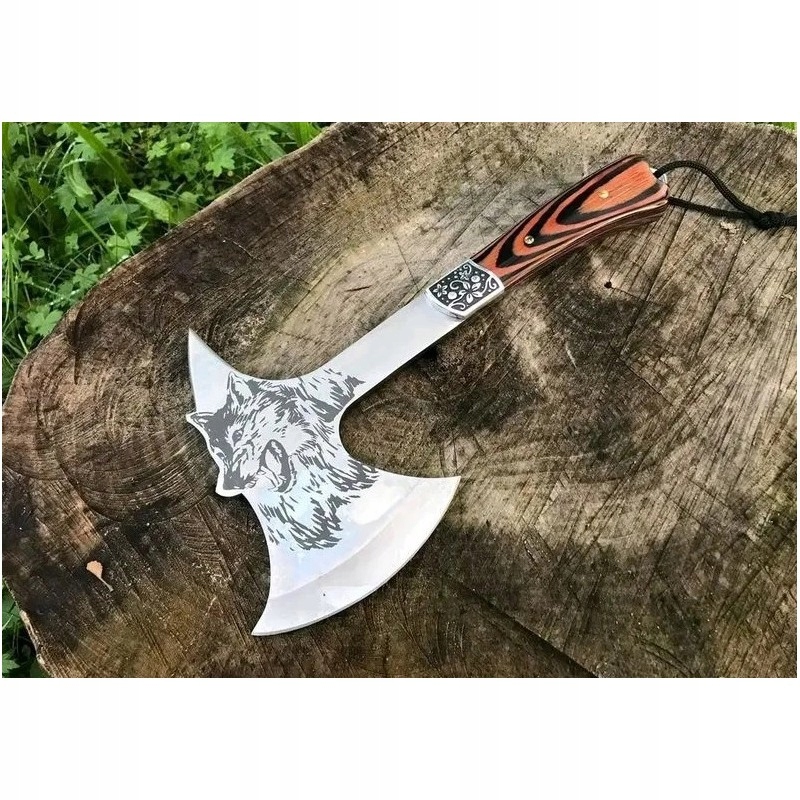 Сокира виготовлена з сталі високої твердості. Декорована дерев'яна ручка забезпечує міцне захоплення. З обох сторін лазерне гравіювання красиве зображення вовка. Вигнутий край можна використовувати для розколювання та розривання.