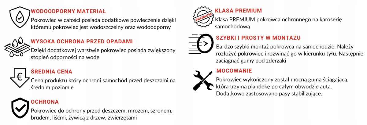 Ідеально захищає автомобіль від дощу, снігу, морозу та морозу, бруду, ультрафіолетових променів, пташиного посліду або тварин, які потрапляють в автомобіль.