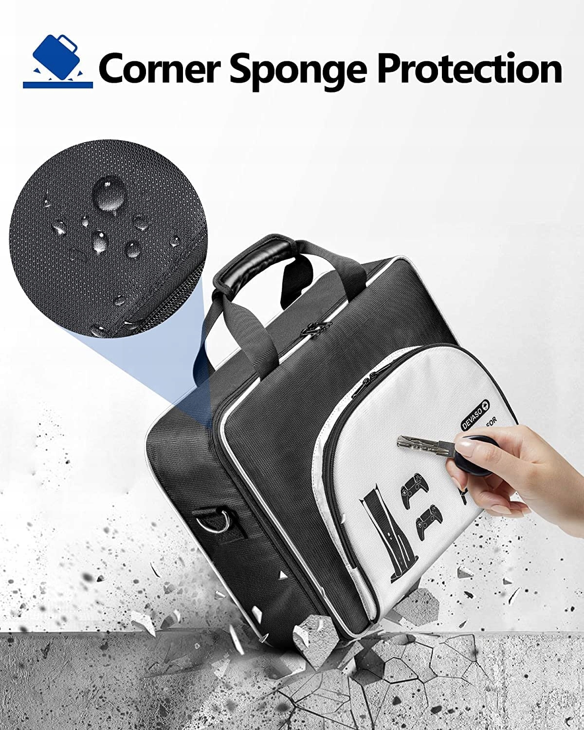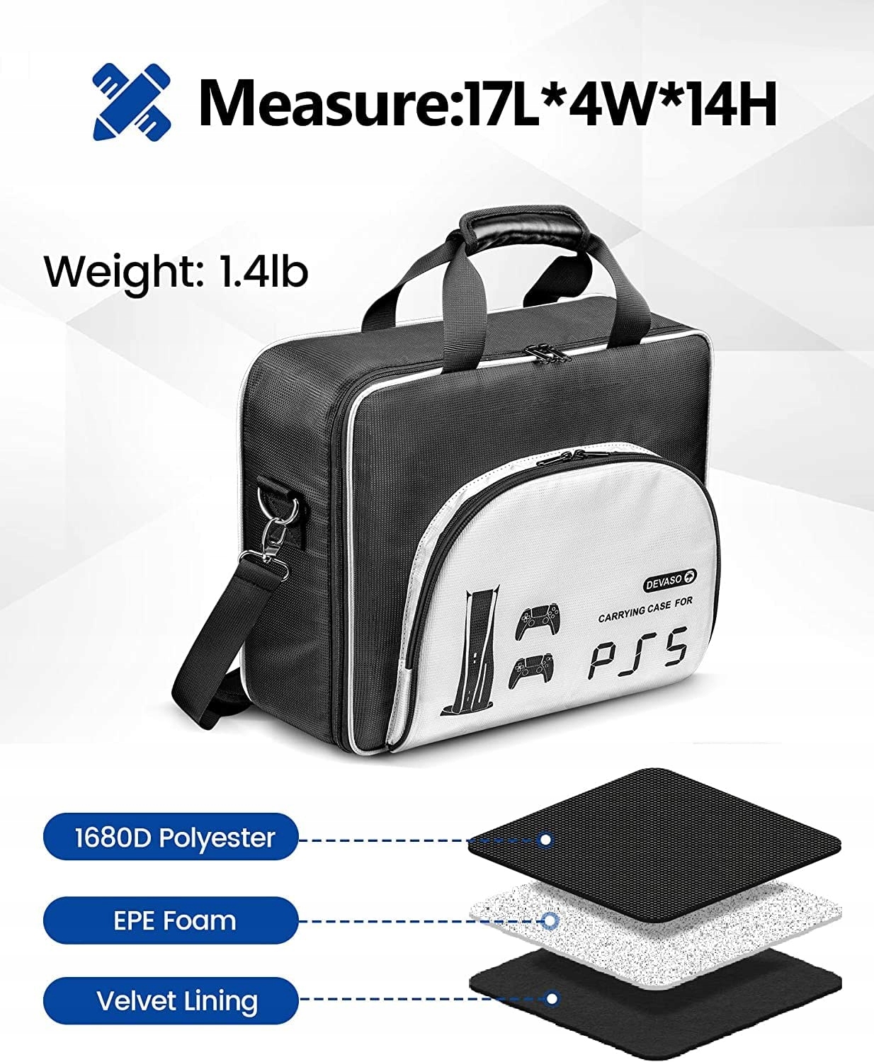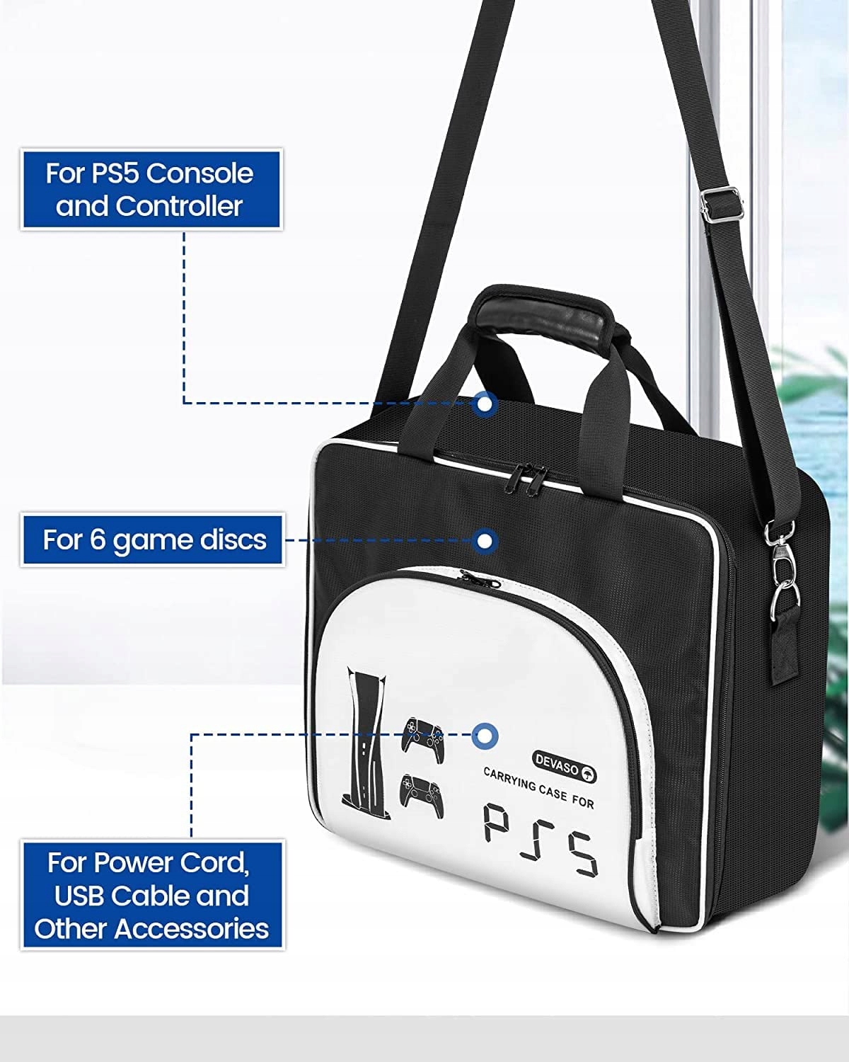 【Потужна конструкція для зберігання】: основна сумка ідеально підходить для вашої PlayStation 5. Основна сумка має різні відділення для зберігання ваших ігрових дисків! Шнури живлення, кабелі HDMI і USB та інші аксесуари можна помістити в передню кишеню. До передньої кишені додано два додаткових відділення для контролера! Це зменшує вплив сторонніх тіл на вміст упаковки, захищаючи її від пошкоджень.
