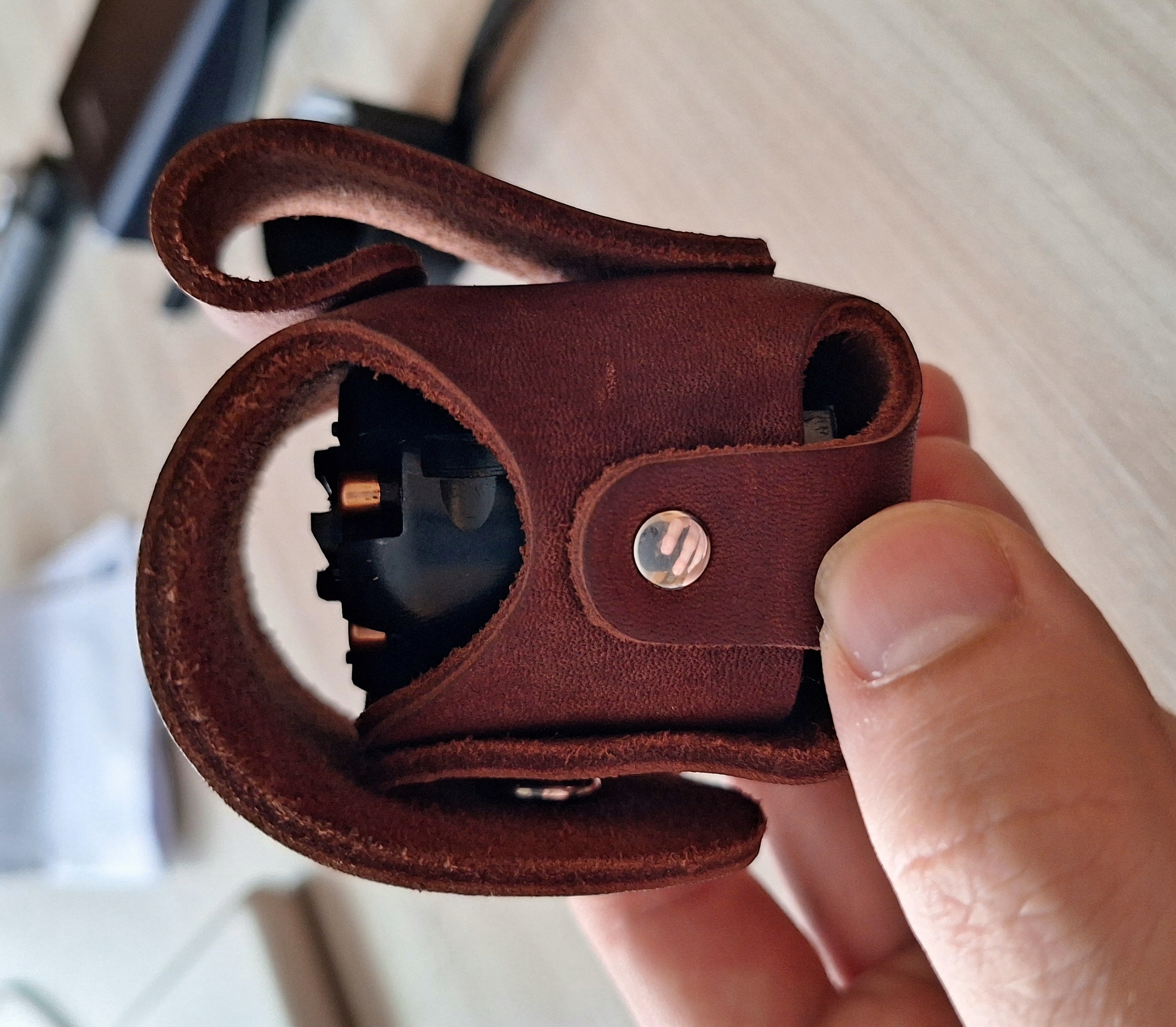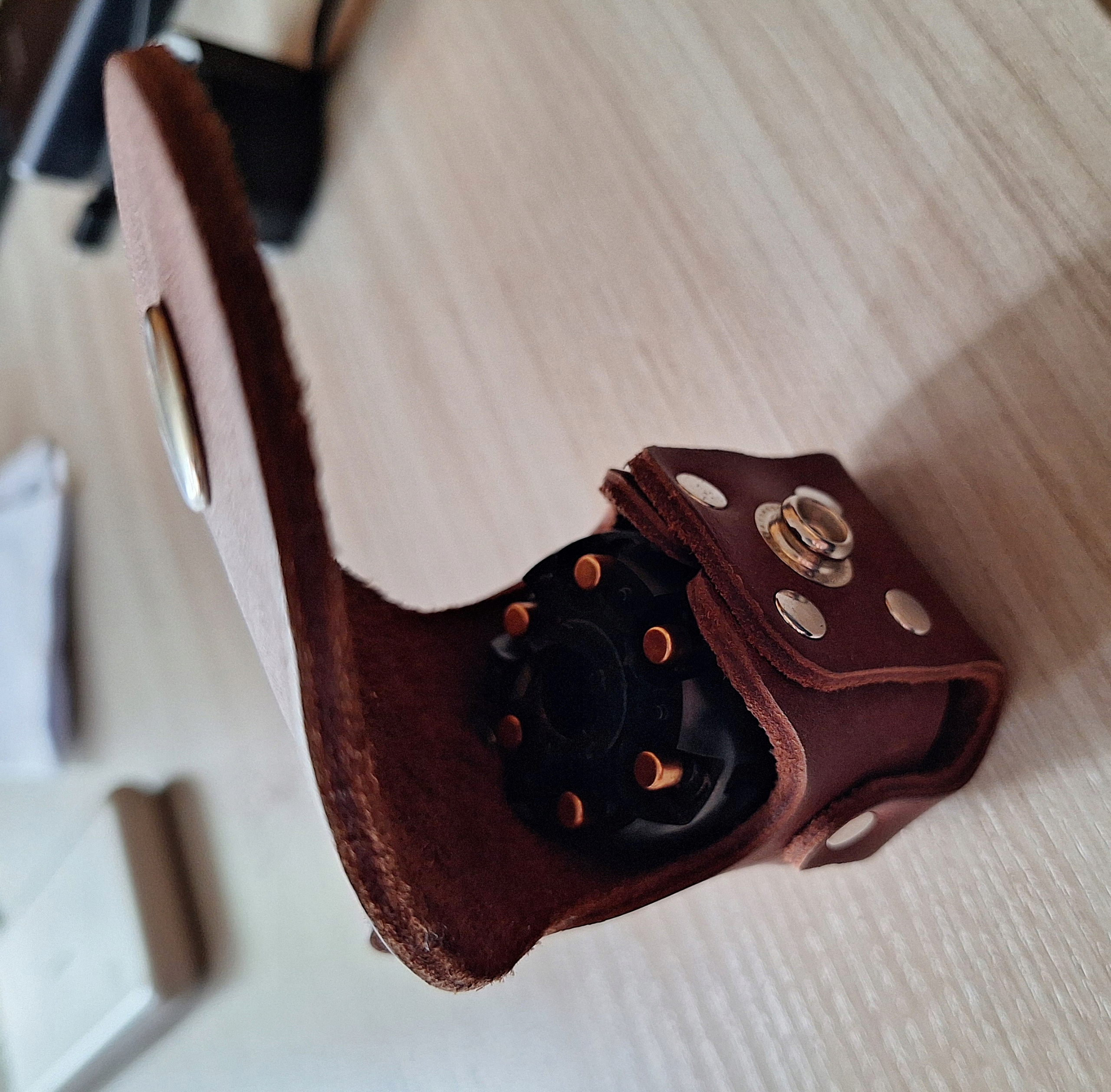 Шкіряний чохол/кобура/чохол для барабана Remington calibre 44 виготовлено з натуральної матової чорної шкіри товщиною 3,0–3,2 мм польських шкіряних заводів, що робить його міцним і гнучким. Чохол можна повісити на брючний ремінь макс. 4 см шириною. Кріплення за допомогою шпильки дозволяє швидко зняти барабан з чохла.