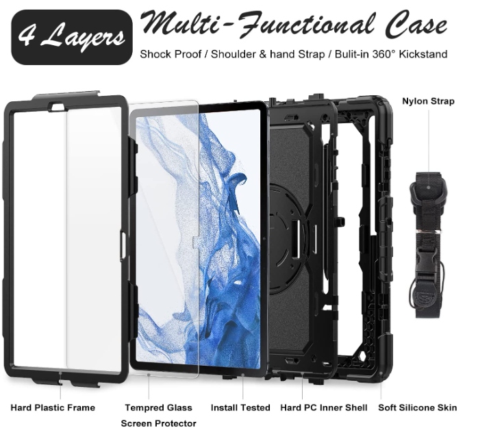 - ➤【ПОВНИЙ ЗАХИСТ】3-шаровий броньований чохол захищає ваш Samsung Galaxy Tab S7 Fe/Tab S8 Плюс проти падінь, подряпин, ударів і подряпин. Тверда внутрішня оболонка, м’яка силіконова зовнішня оболонка та вбудований захисний екран захищають від повсякденної діяльності та нещасних випадків. М’який на дотик матеріал забезпечує зручне та надійне утримання в руці.