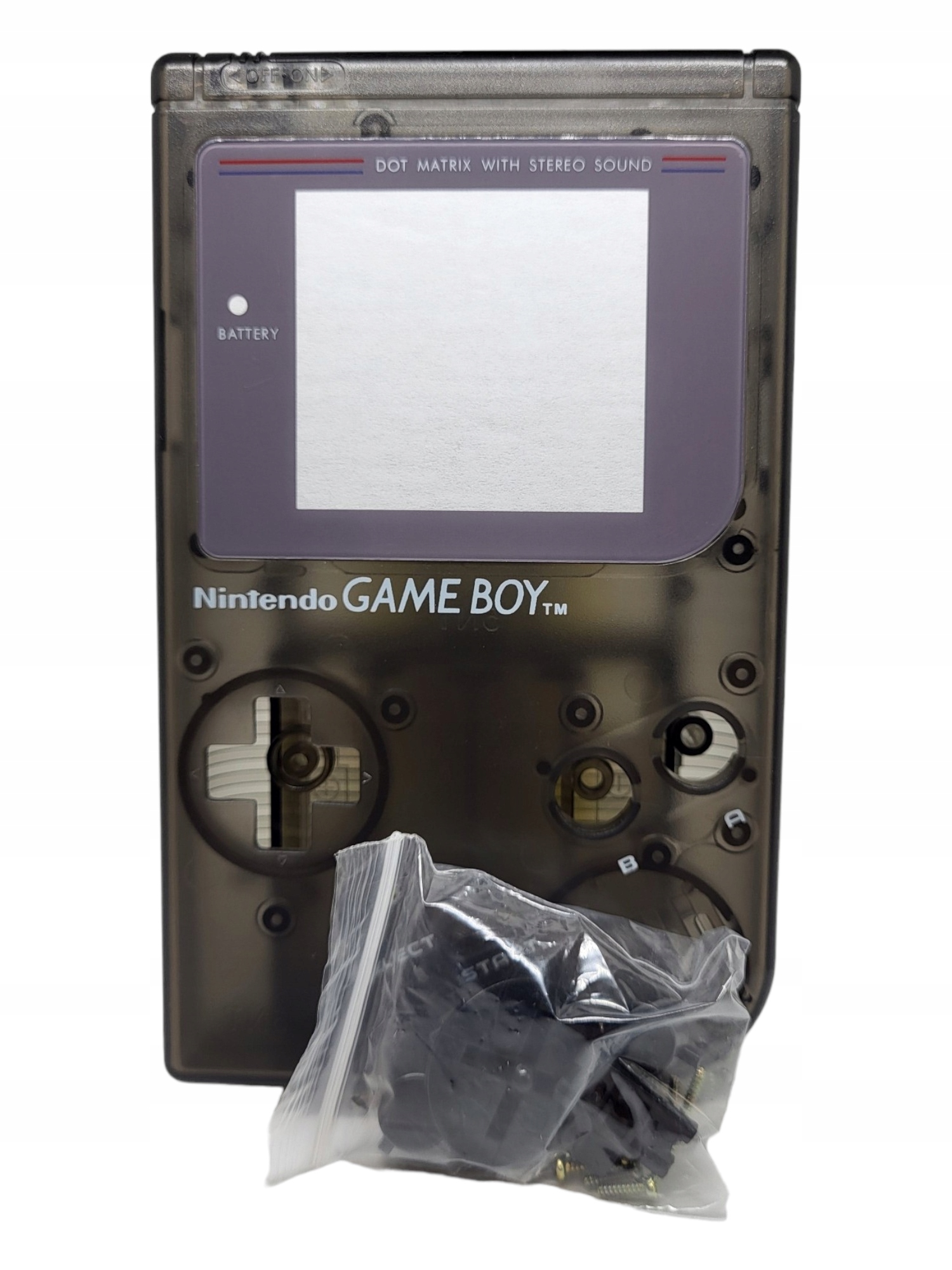 Змінний корпус для Game Boy Classic DMG - чорний прозорий зі склом із самоклеючою фольгою, кнопками, гумками для кнопок (немає на фото), гвинтами та пилозахисним чохлом.