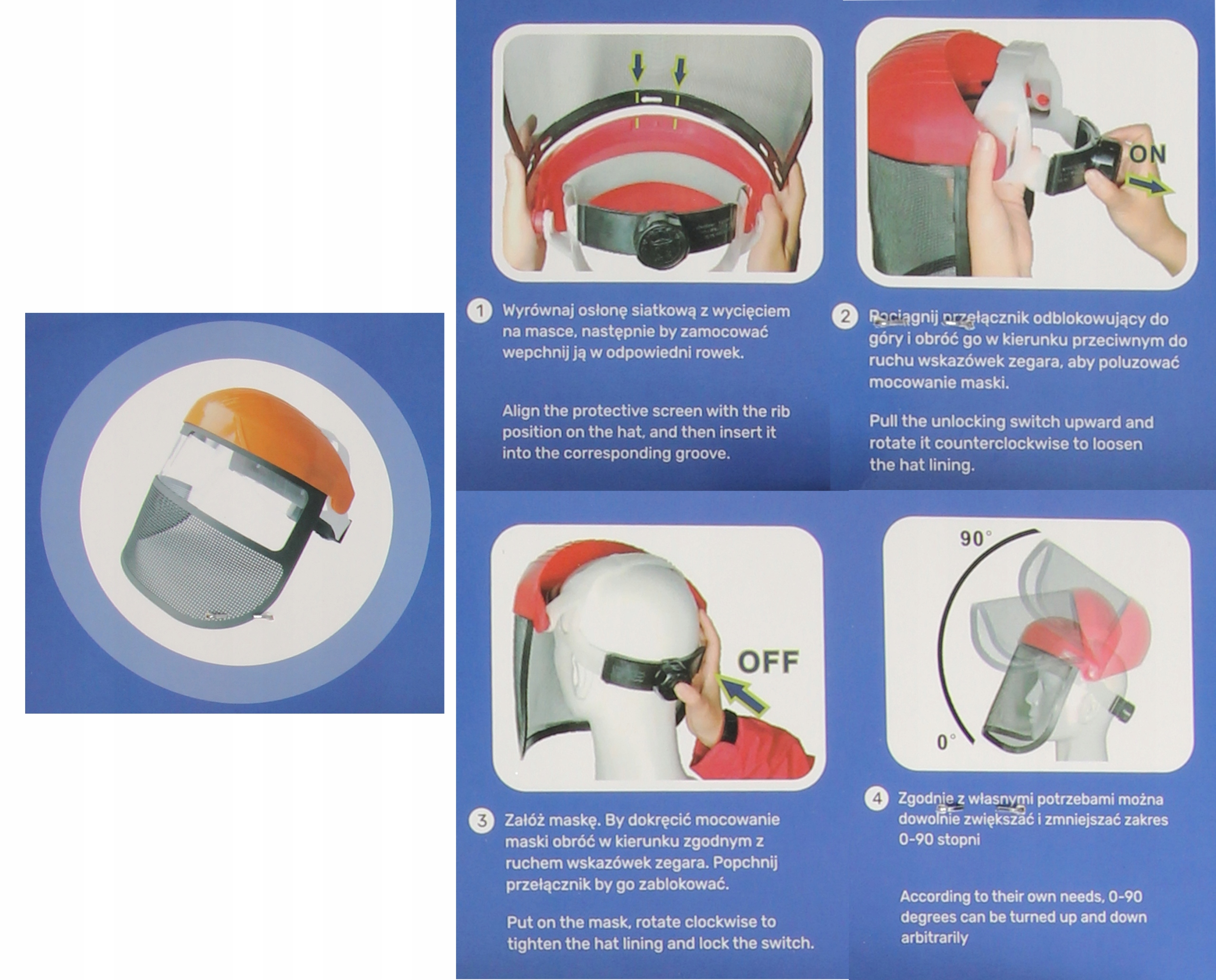 - Маска оснащена антитрибальною смугою . Перед використанням його слід видалити. Вирівняйте кришку сітки з вирізом на масці, а потім прикріпити її у відповідну канавку. Потягніть перемикач розблокування вгору і поверніть його у зворотному напрямку до руху за годинниковою стрілкою, щоб послабити кріплення маски. Одягніть на маску. Затягнути маску, що кріпляться в напрямку, що відповідає руху за годинниковою стрілкою. Натисніть перемикач, щоб заблокувати його. Відповідно до власних потреб, ви можете вільно збільшувати та зменшити діапазон 0-90 градусів