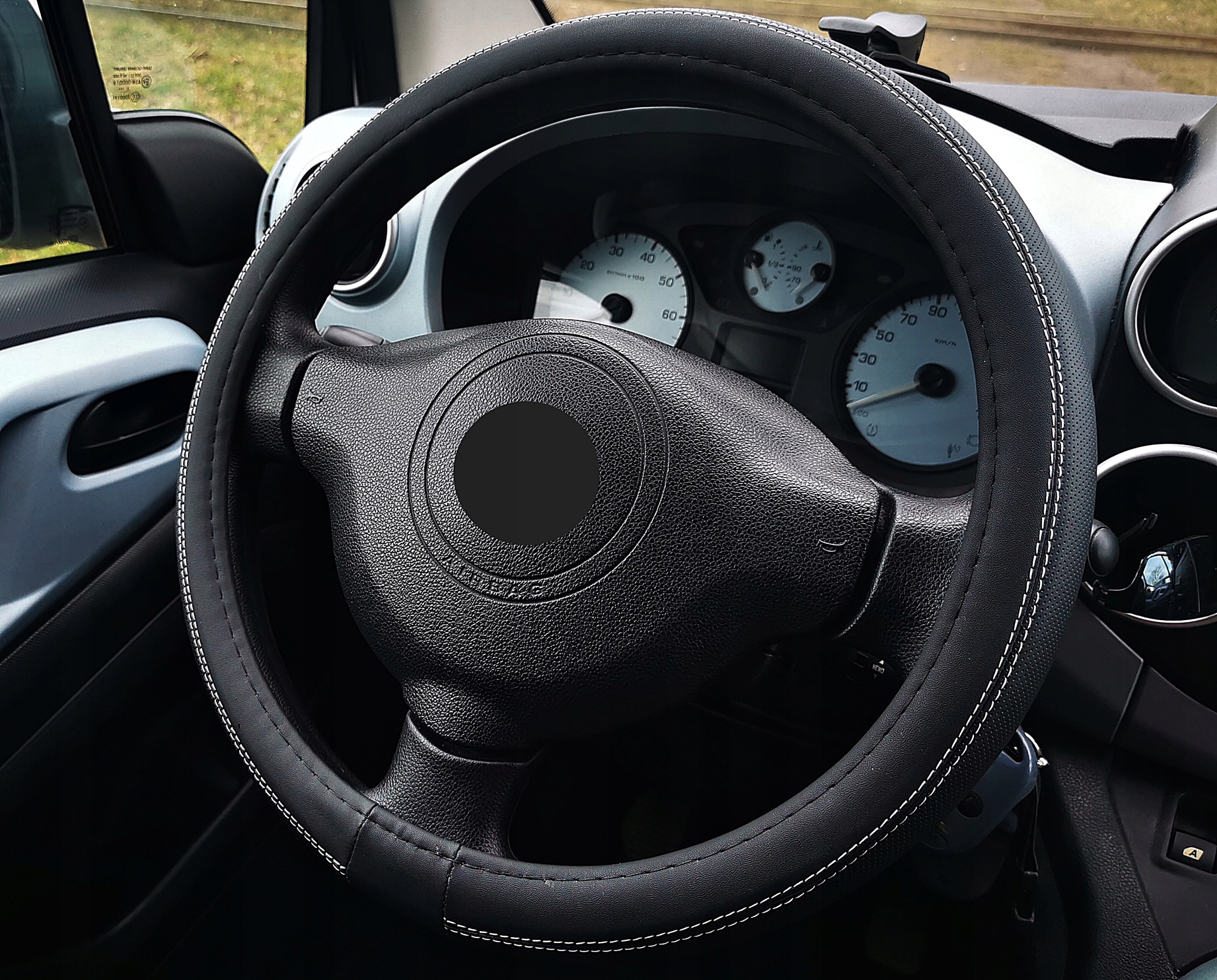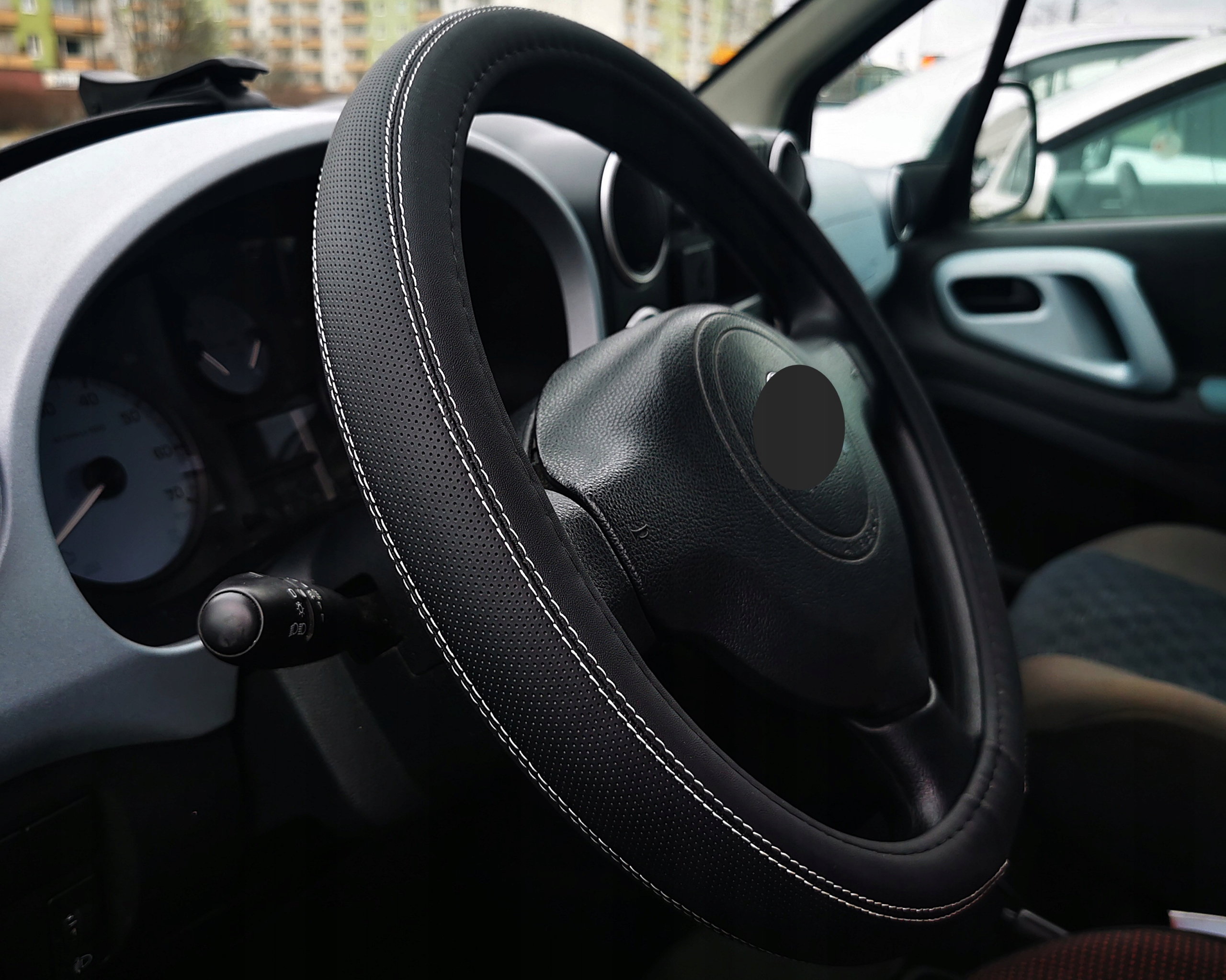 Чохол на кермо з високоякісної перфорованої екошкіри в поєднанні з гладкою екошкірою (чорна матова).