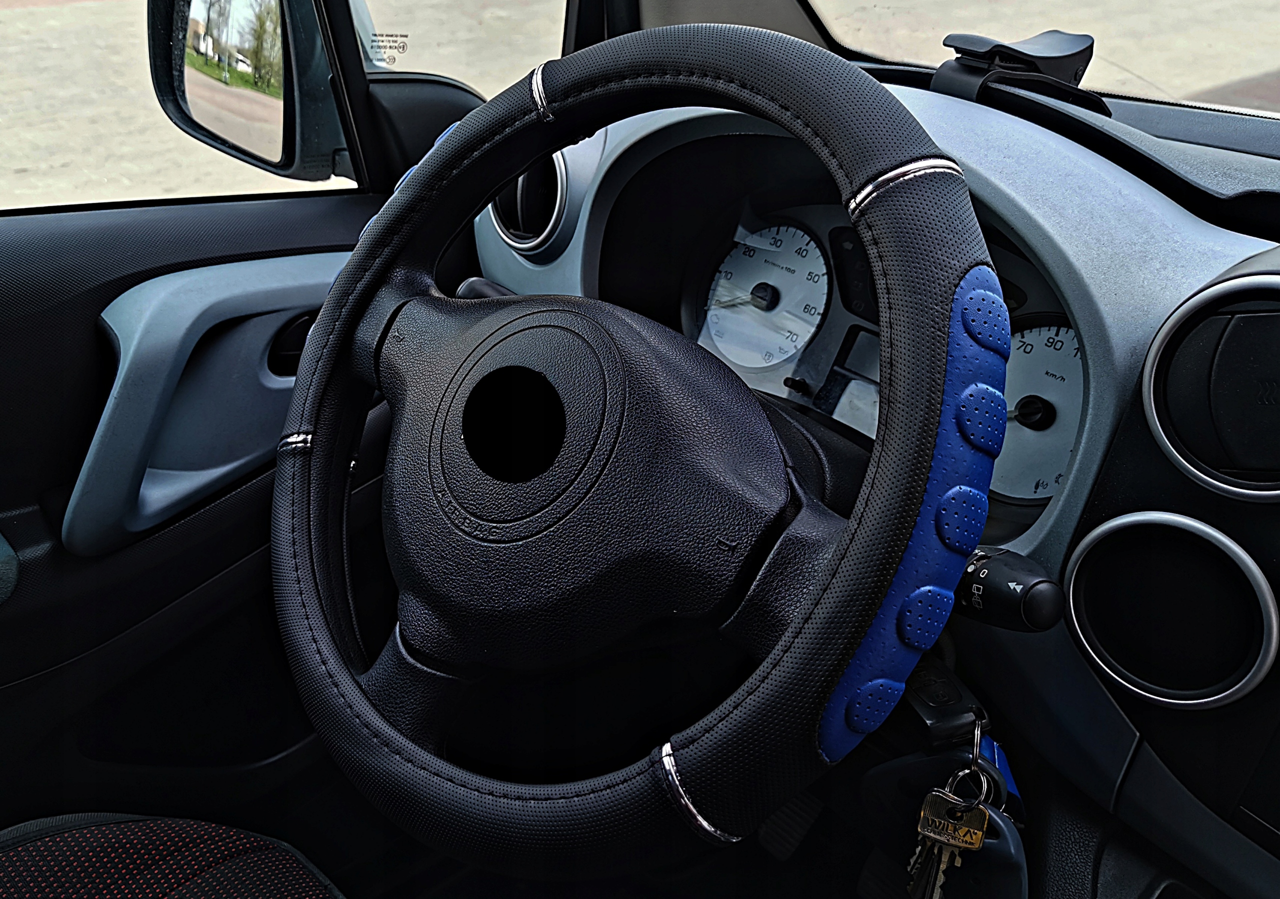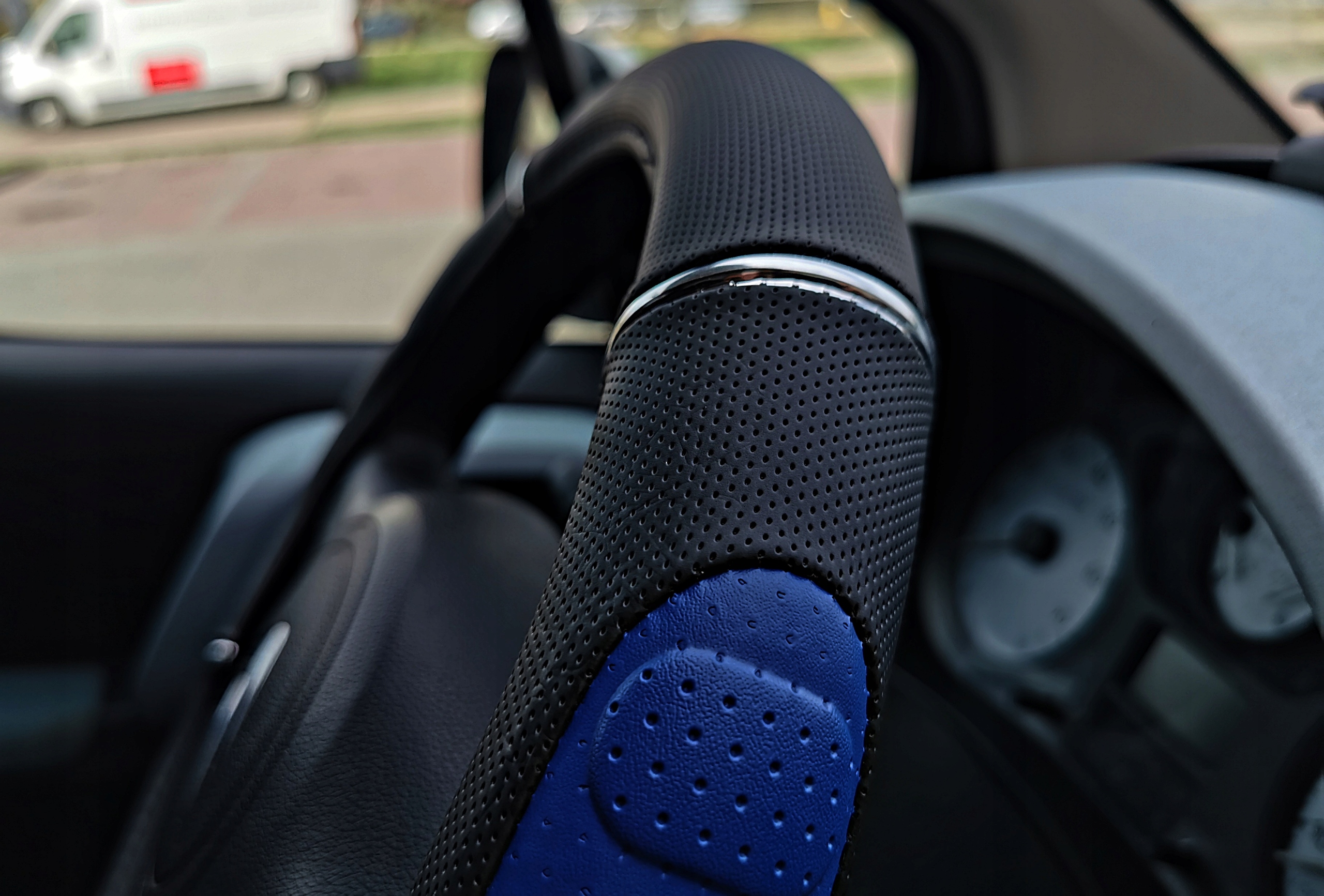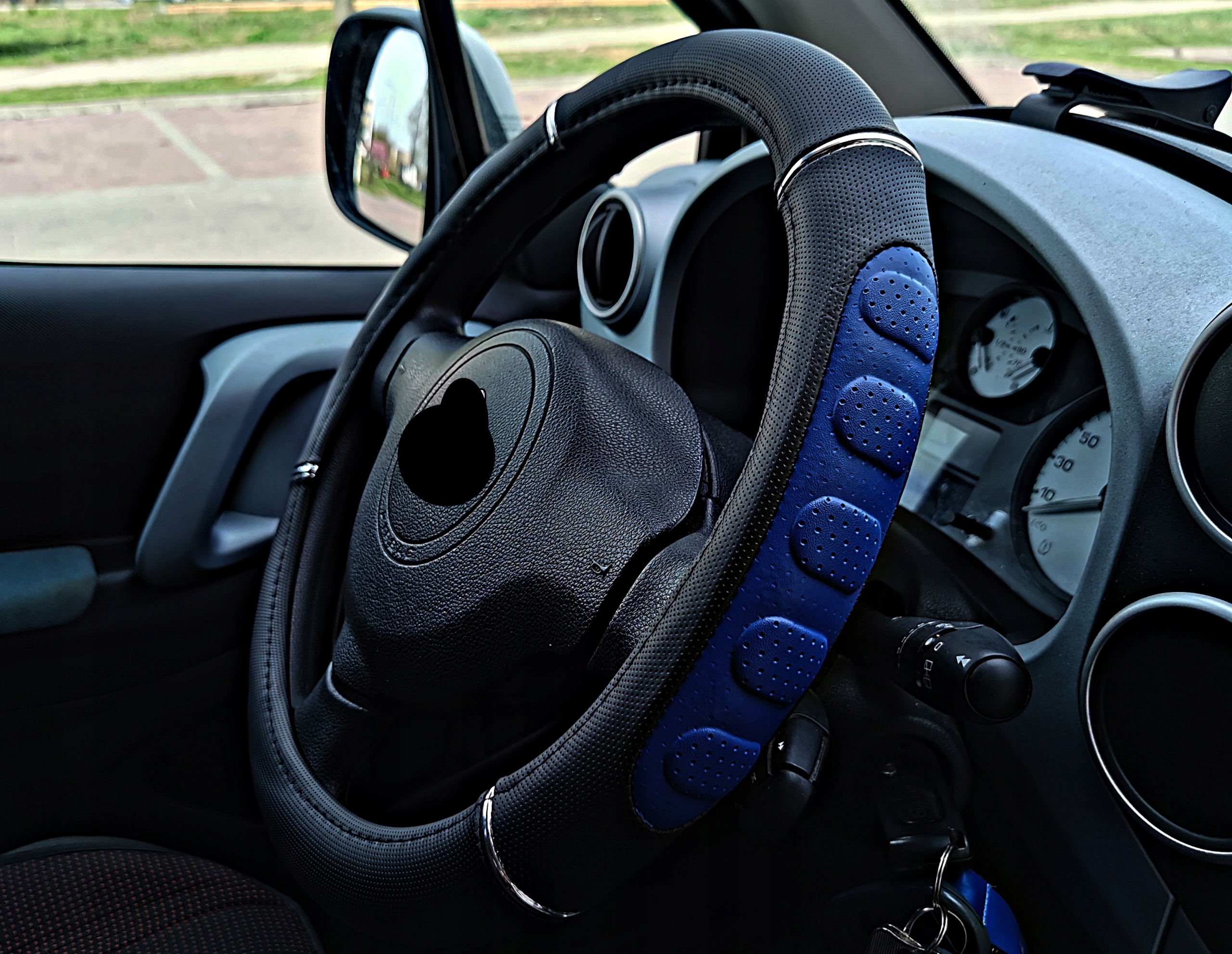 Чорно-синій чохол на кермо з високоякісної перфорованої екошкіри з хромованим покриттям.