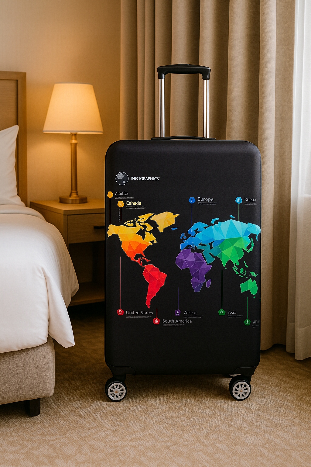 Чохол для валізи з кольоровим мотивом карти світує не лише привабливою прикрасою, але, перш за все, захищає ваш багаж від бруду, подряпин і пошкоджень під час подорожі. Виготовлений з гнучкого матеріалу, він ідеально підходить за формою валізи і легко одягається. Завдяки насиченим кольорам і оригінальному малюнку ви легко впізнаєте свою валізу в аеропорту. Доступний у кількох розмірах, підходить для більшості стандартних моделей валіз.