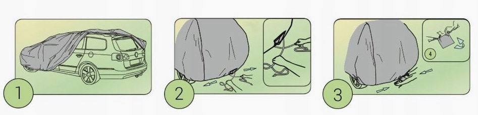 Перед тим, як надіти чохол на автомобіль, складіть бічні дзеркала та складіть або відкрутіть антену. Покладіть чохол на чистий і сухий автомобіль надрукованою стороною назовні. Для полегшення правильного розташування чохла на автомобілі в чохол спереду вшита вставка FRONT і ззаду чохла ярлик REAR (маркування збігається з передньою і задньою частиною автомобіля). Перехрестіть лінії стяжної муфти, щоб утворити перше з’єднання вузла, потім міцно потягніть лінії, спрямовуючи зусилля паралельно задньому краю автомобіля (див. Малюнок 2). Зав’яжіть шнури стяжної муфти та перевірте, щоб вузол не розв’язався, коли ви тягнете стяжну муфту. Якщо вузол розв’язується, повторіть операцію, змінивши спосіб зав’язування. Протягніть додаткові шнури через петлі, вшиті в нижній край чохла біля коліс автомобіля, і за допомогою них прикріпіть чохол до дисків автомобіля (не кріпіть його до ковпаків).