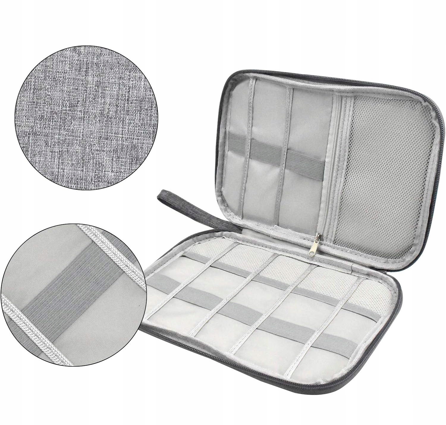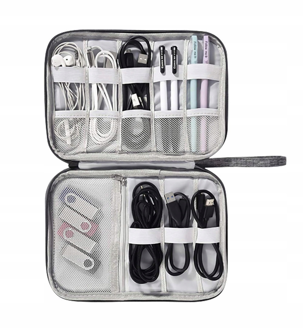 Упорядкуйте дрібну електроніку в одному естетичному футлярі, який можна брати з собою всюди. Якісний органайзер для кабелів, проводів, карт пам'яті та всіх інших аксесуарів для електроприладів. Виріб має велике відділення на блискавці, велику кількість відділень і вкладок для зберігання необхідних аксесуарів. Чохол для кабелів та електроніки з ручною петлею, виготовлений із сірого меланжевого матеріалу на блискавці.
