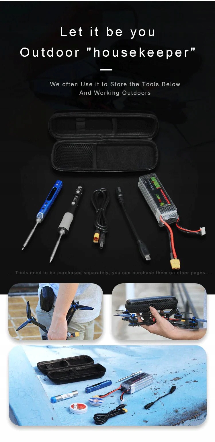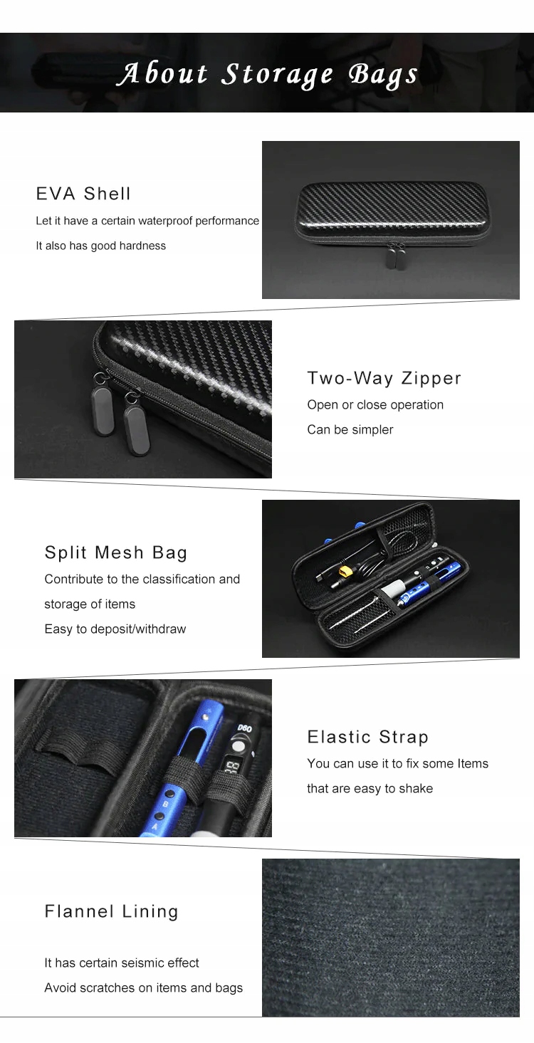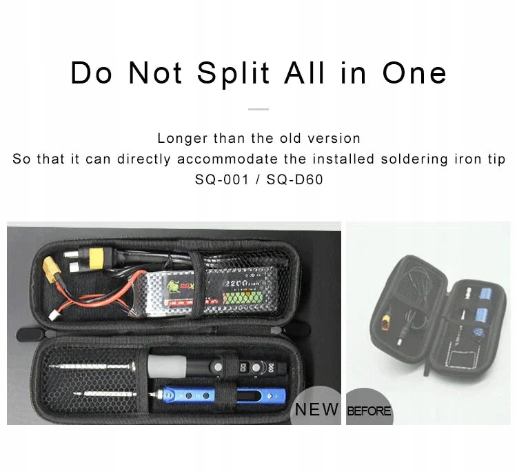 Чохол для зберігання виготовлений з EVA на подвійній блискавці. Вміщує один паяльник SQ-001, дві зварювальні насадки, одну батарейку 4S і шнур живлення. Також можна використовувати як невелику сумку для інструментів для зберігання викруток, батарейок, паяльників та інших дрібних аксесуарів. Сумка для зберігання дає можливість встановити електропаяльник SQ-001, SQ-D60 без розбирання жала паяльника!