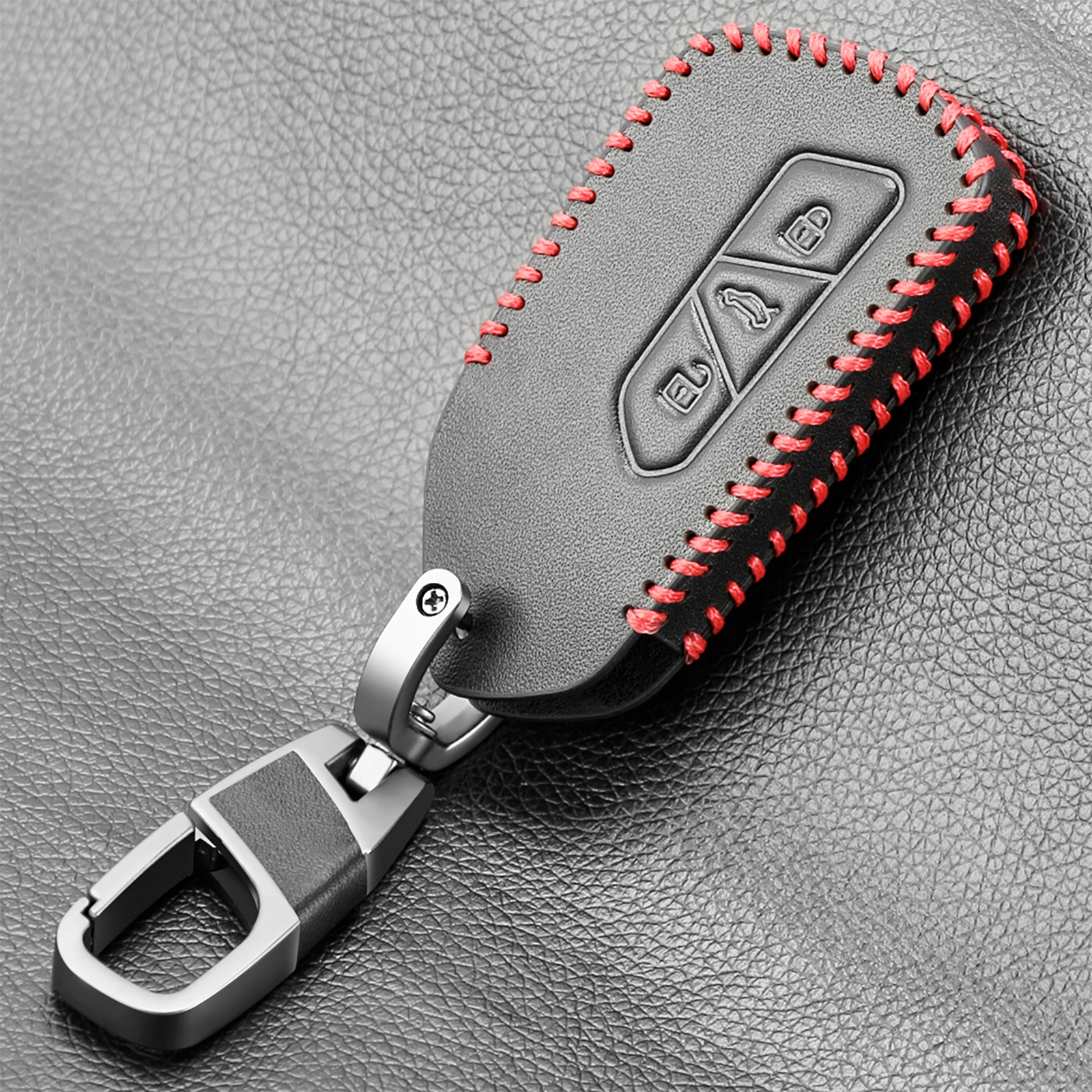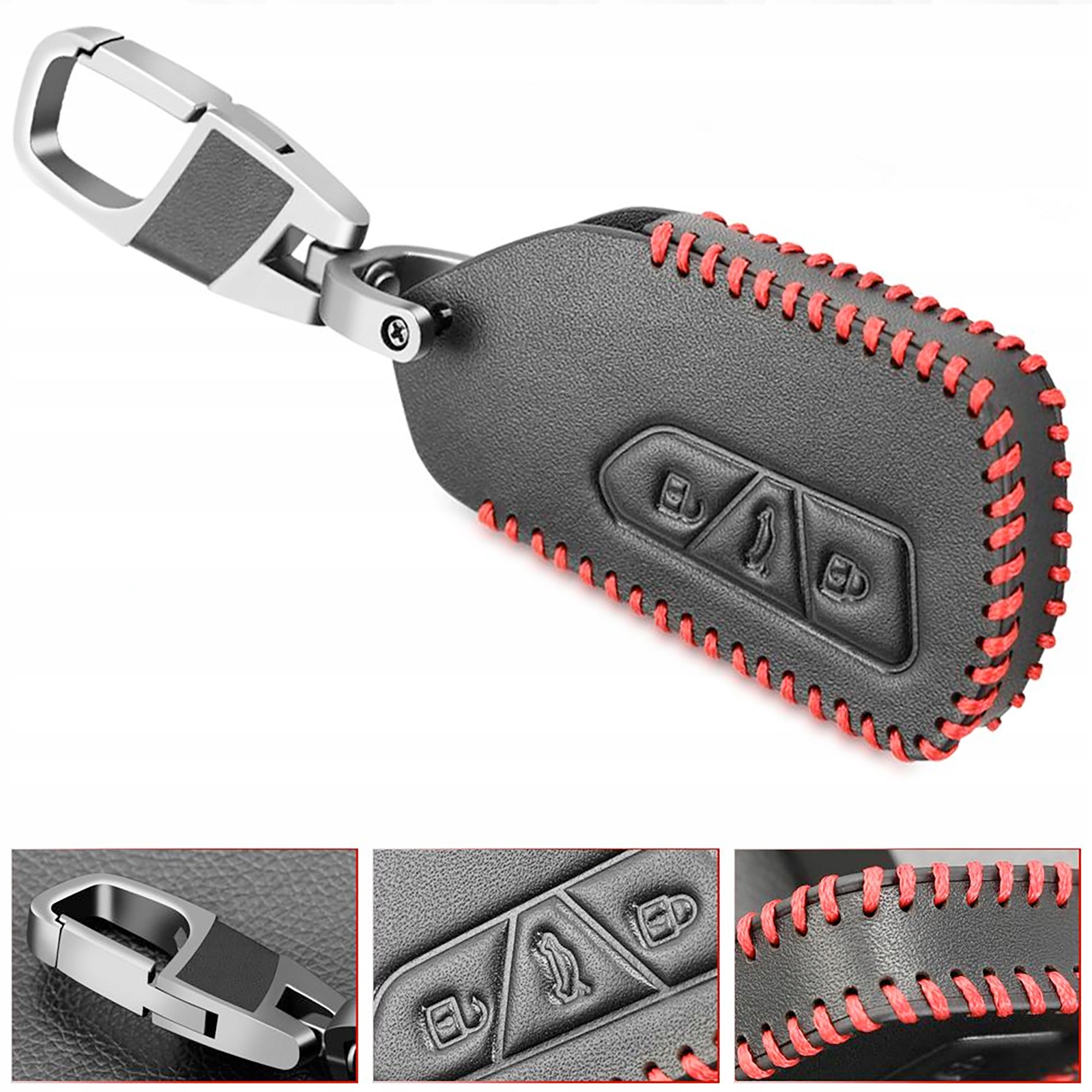 Ми пропонуємо зшиті вручну футляри для ключів усіх марок і моделей легкових автомобілів тощо. Ключі виготовлені з натуральної чорної шкіри, прошиті товстою червоною ниткою Кожен футляр оснащений практичним сталевим карабіном, лакованим титановим кольором.