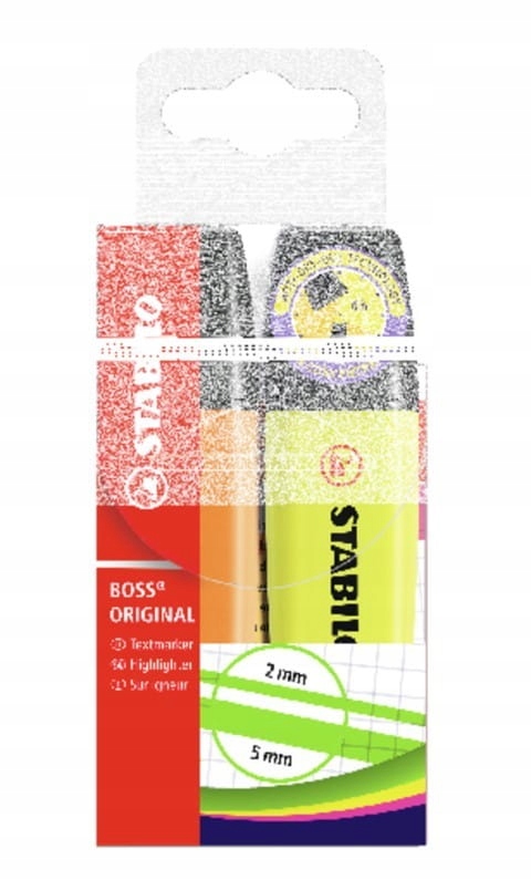 STABILO BOSS ORIGINAL - справжня класика серед хайлайтерів. Він доступний у 19 кольорах, у тому числі 9 неонових і 10 пастельних, що дає практично необмежені можливості для створення та виділення текстів. Товщина лінії від 2 до 5 мм дозволяє виділяти тексти різного розміру, а технологія Anti-dry забезпечує тривалість чорнила до 4 годин. Задля захисту навколишнього середовища всі чорні частини хайлайтера виготовлені з переробленого пластику. У наборі 2 штуки хайлайтерів у футлярі в міксі кольорів. STABILO BOSS ORIGINAL, безумовно, є ключовим елементом в оснащенні кожного офісного чи шкільного пеналу.