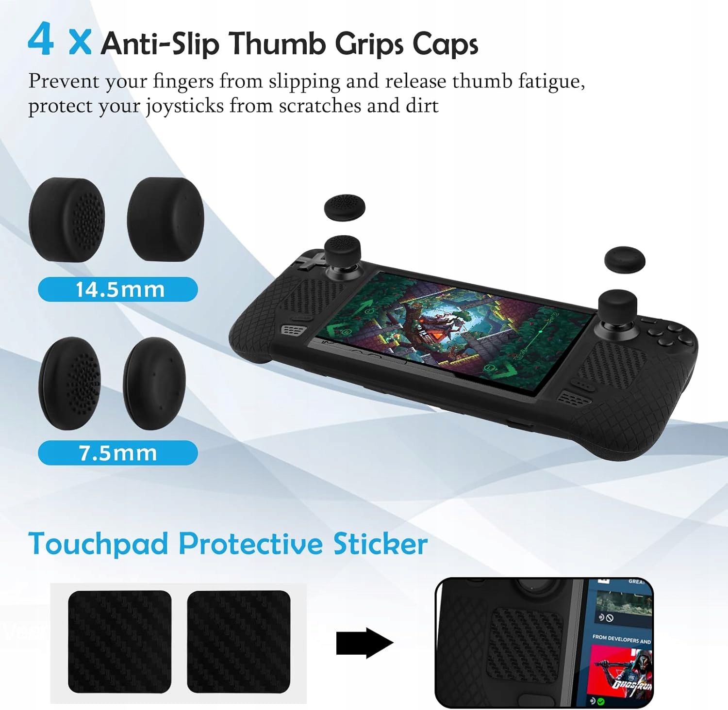 - Інші спеціальні засоби захисту: Окрім покриття парової колоди, набір також включає 4 ручки для великих пальців і 2 наклейки для захисту сенсорної панелі. Захват для великого пальця запобігає ковзанню пальців і знімає втому великого пальця, захищає джойстики від подряпин і бруду. Наклейка захисту сенсорної панелі може захистити та прикрасити вашу сенсорну панель.