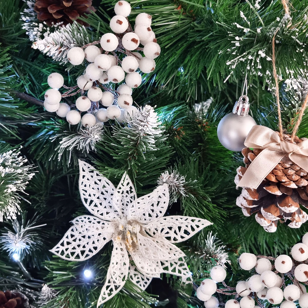 - Додатково : натуральні шишки, ефект глазурі гілок (біла частина, білий блиск)