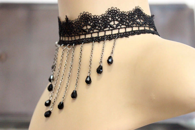 Готичне кольє з чорного мережива зі срібними ланцюжками, внизу з чорними краплеподібними намистинами.
