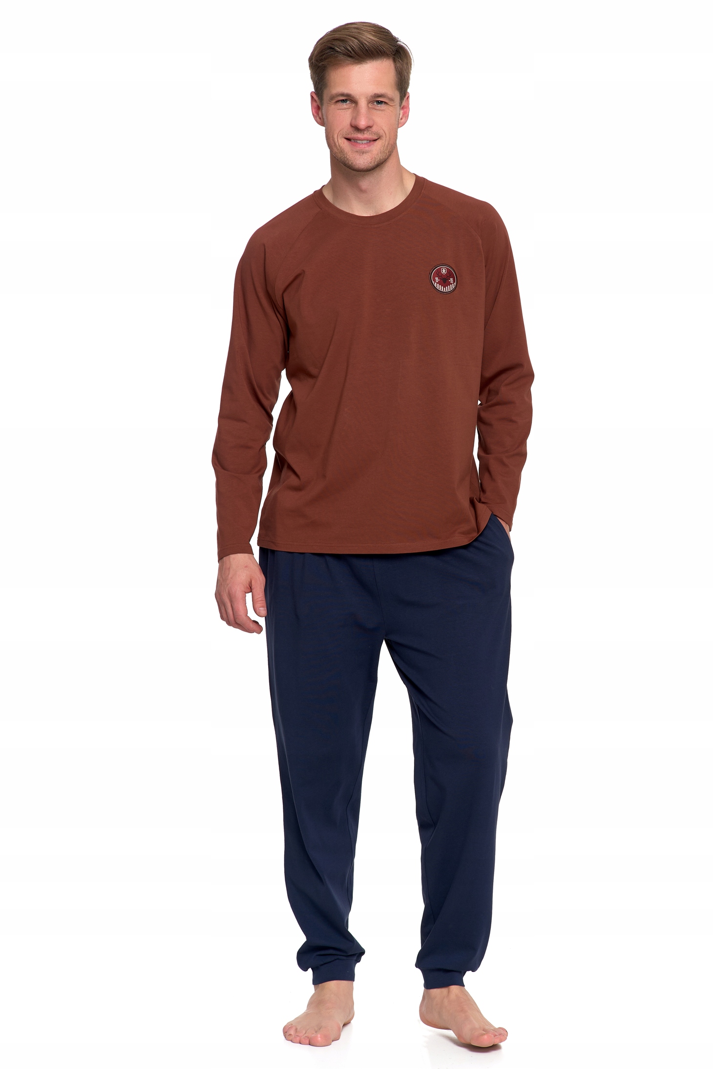 Ця чоловіча піжама з довгими рукавами та нашивкою з оленями – ідеальний вибір для любителів природи та комфорту. Теплий, м'який і гнучкий, він забезпечить вам комфорт, коли на вулиці стає холодніше. Коричневий верх і темно-синій низ створюють стриманий комплект, який поєднує в собі класичний стиль із відтінком стильної невимушеності. Важливо: відсутність бирки на шиї означає відсутність подряпин і повний комфорт у будь-якому положенні.