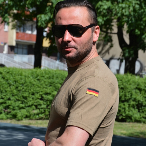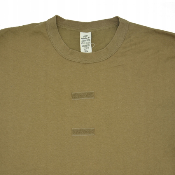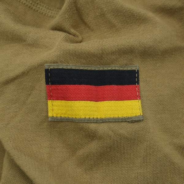 Оригінальна футболка із засобів німецької армії - Бундесверу. Виготовлений з високоякісного матеріалу, що складається з 68% бавовни, 32% поліаміду. Футболка еластична, тому ідеально прилягає до нашого тіла. На обох рукавах німецькі прапори. Спереду є подвійна липучка, також є моделі з одинарною і навіть без. Майте це на увазі.