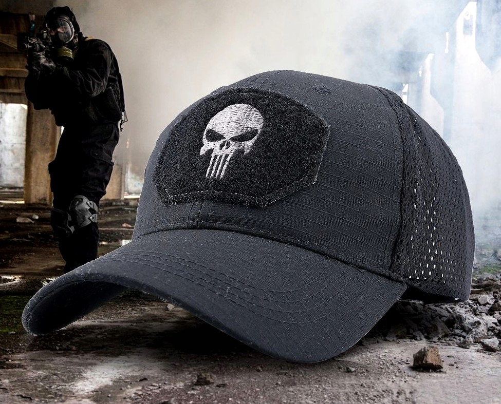 Чоловіча бейсболка Skull PUNISHER, чорна вишита сітка