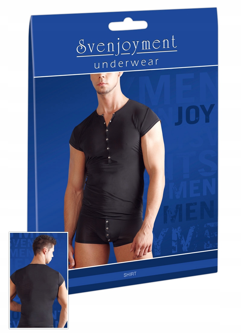 Злегка прозора еластична чоловіча футболка з короткими рукавами та сріблястими застібками.