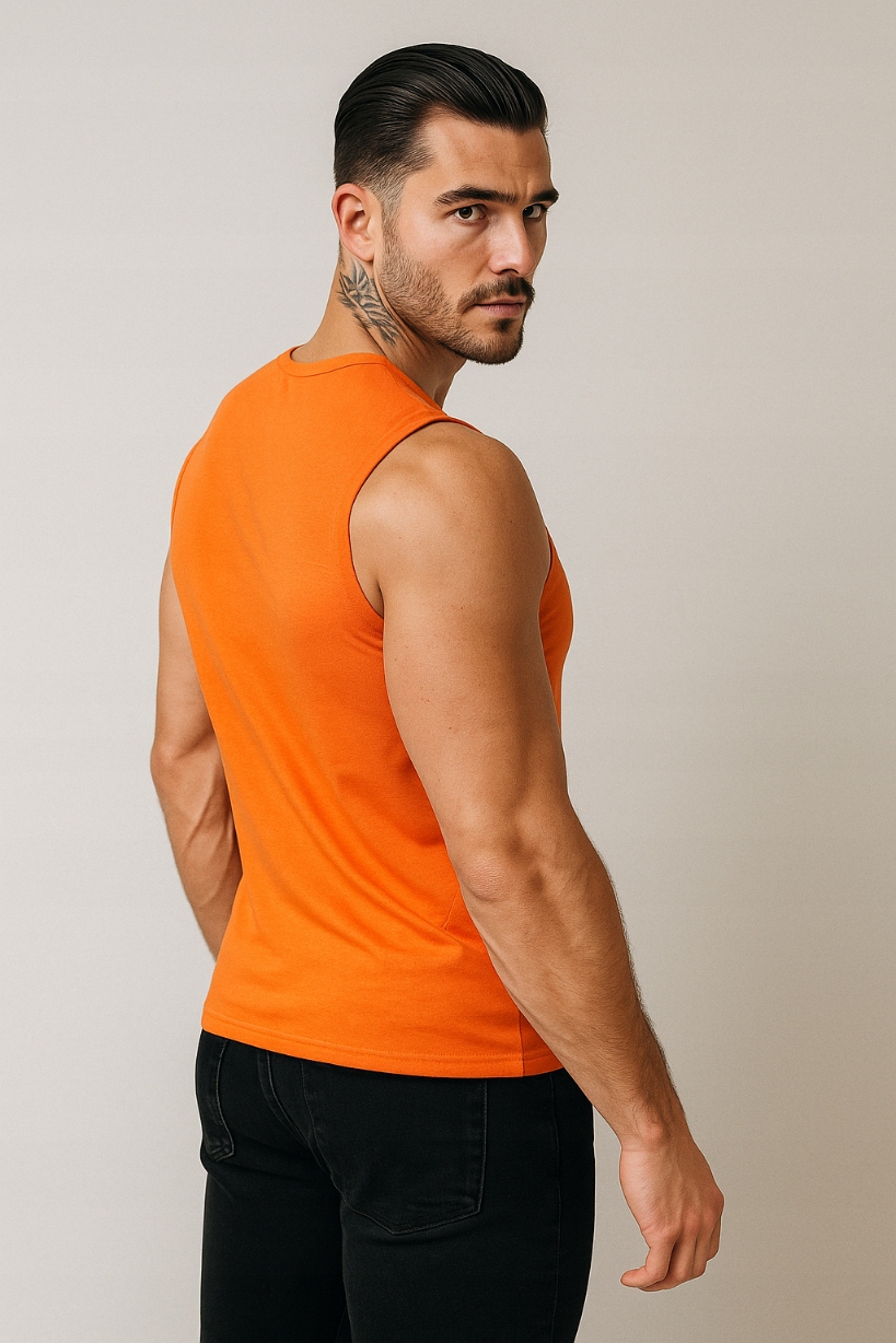 Виразна чоловіча безрукавка помаранчевого кольору — пропозиція для сміливих і впевнених у собі чоловіків. Ідеально підходить для тренувань, у спекотні дні та як елемент літнього стилю. Енергійний колір підкреслює спортивний характер і додає характер будь-якому вбранню.