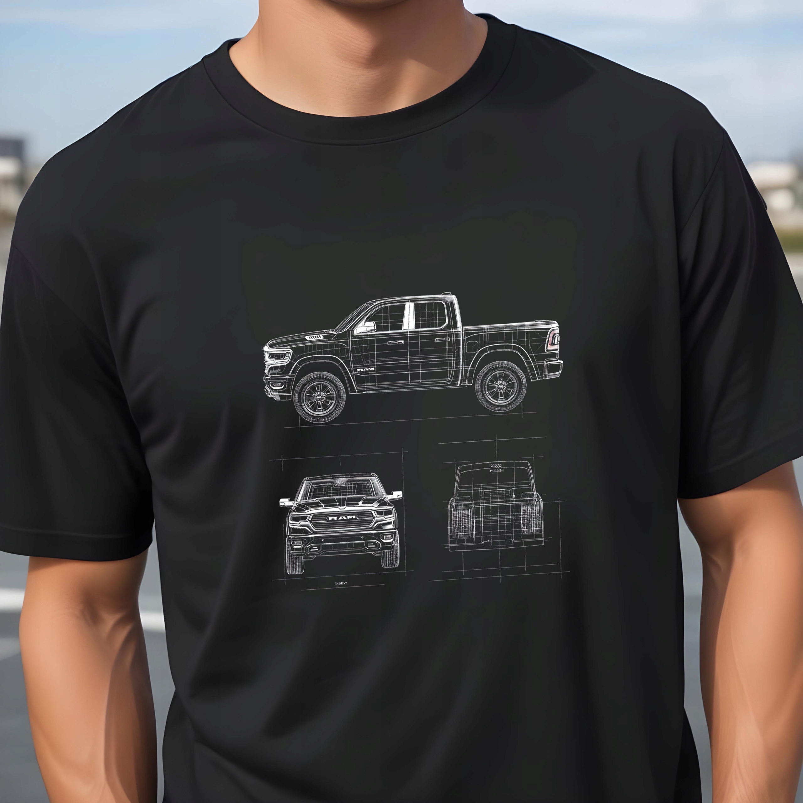 На передній частині футболки є технічний ескіз легендарного Dodge RAM, який представляє автомобіль у трьох видах: збоку, спереду та ззаду. Це оригінальний малюнок, який привертає увагу та ідеально підкреслює характер футболки.
