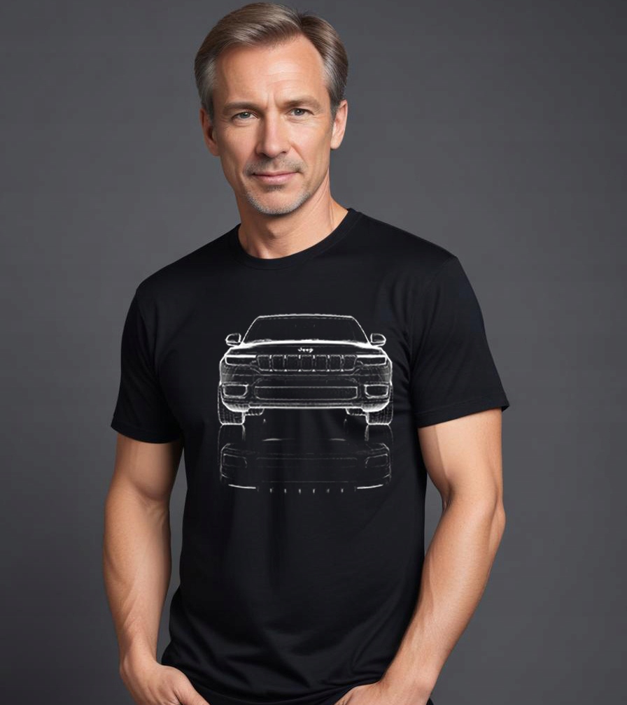 Чоловіча футболка з унікальним малюнком із зображенням технічного ескізу автомобільної легенди - Jeep Grand Cherokee.