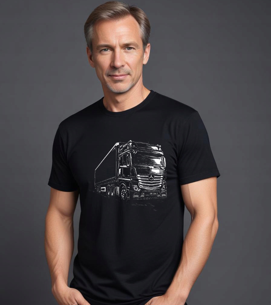 - Колір футболки: чорний із білою графікою Mercedes-Benz Actros у реалістичному напівтоновому малюнку