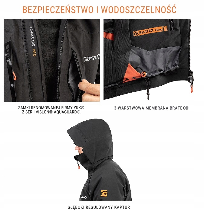 Завдяки використанню 3-шарової мембрани BRATEX® з водонепроникними та дихаючими параметрами 25 000 мм H2O/20 000 г/м2/24 год, куртка забезпечує чудовий захист від дощу та вітру. Спеціально розроблене покриття TEFLON® дозволяє воді вільно стікати з поверхні тканини, а бруд менше прилипає до неї, що полегшує очищення. Крім того, куртка була збагачена захистом від УФ-променів, захищаючи матеріал від вицвітання і вицвітання. Для підвищення ефектності в куртках використовуються верхні блискавки від відомої компанії YKK® із серії VISLON® AquaGuard®.