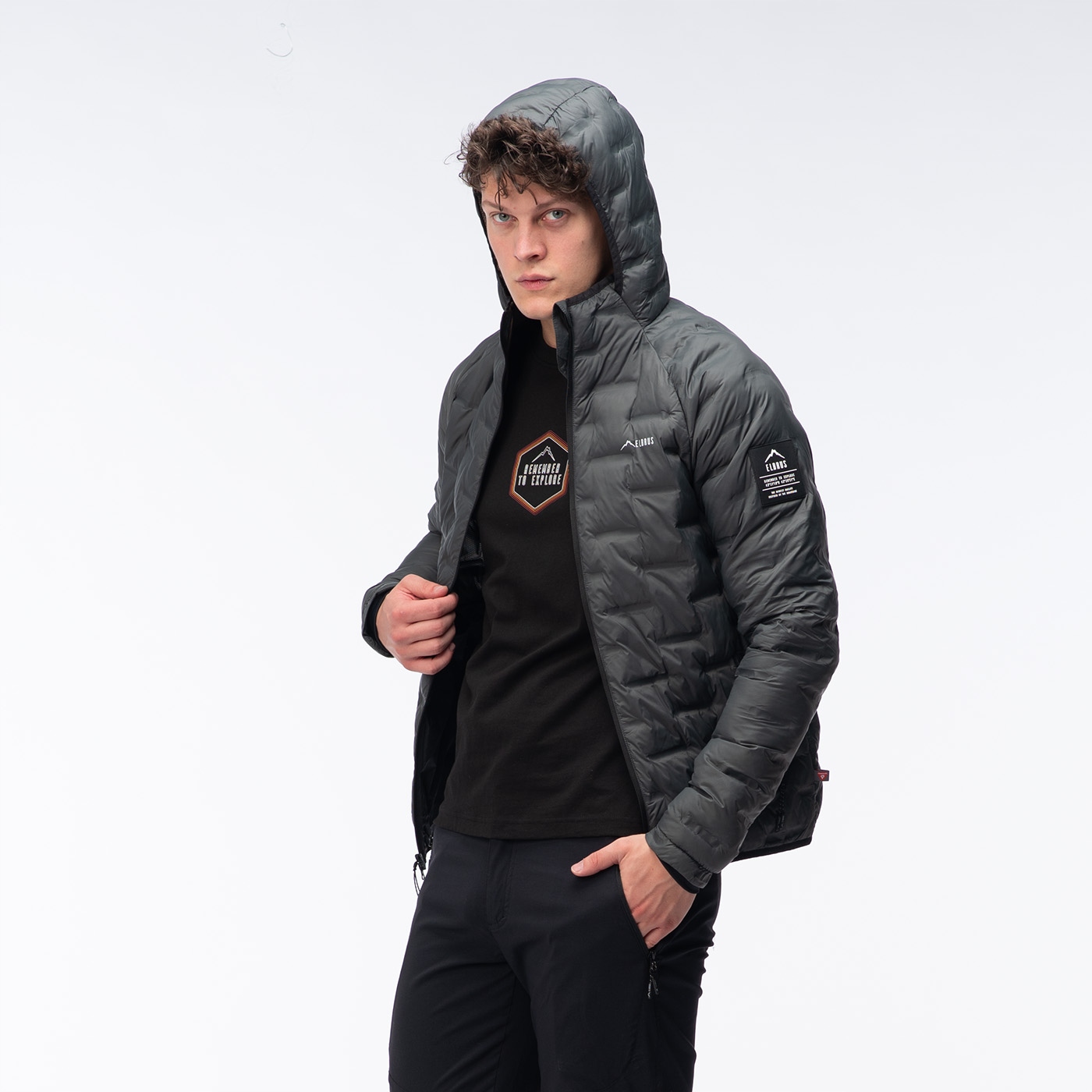 Чоловіча стьобана куртка HUEL PRIMALOFT® від Ельбрус має синтетичний наповнювач PrimaLoft® Silver Insulation Bio, Thermoplume® with Cross Core™ Technology, який має дуже хороші термозберігаючі властивості. Цей тип наповнювача виготовлений на 100% з перероблених волокон. Волокна з Thermoplume® з технологією Cross Core™ підвищують теплову ефективність начинки на цілих 12%. Крім того, ці волокна дуже добре стискаються та не надто швидко вбирають воду. Панелі з наповненням не прошиті, а зварені, завдяки чому утримують наповнення на місці. Оздоблення зсередини шляхом відбиття тепла дозволяє підтримувати потрібну температуру, коли на вулиці мороз. Куртка HUEL PRIMALOFT® має дві бічні кишені, високий комір і стьобаний капюшон. Резинка на талії дозволяє індивідуально підлаштуватися під фігуру. Манжети рукавів оброблені додатковим матеріалом, який захищає від холодного повітря.