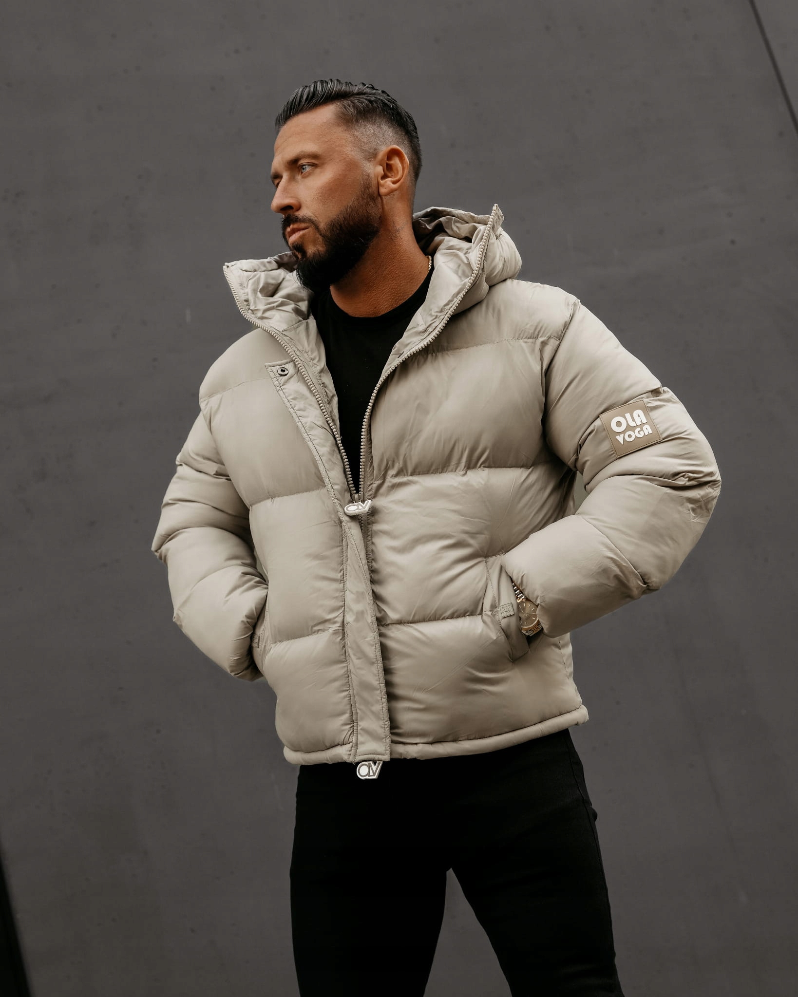 Стьобана чоловіча куртка oversize, застібається на блискавку з логотипом. Модель з високим коміром і просторим капюшоном. Нашивка з логотипом бренду OLAVOGA на рукаві. Стриманий ярлик, вшитий у бічній кишені. Куртка з якісного блискучого матеріалу.