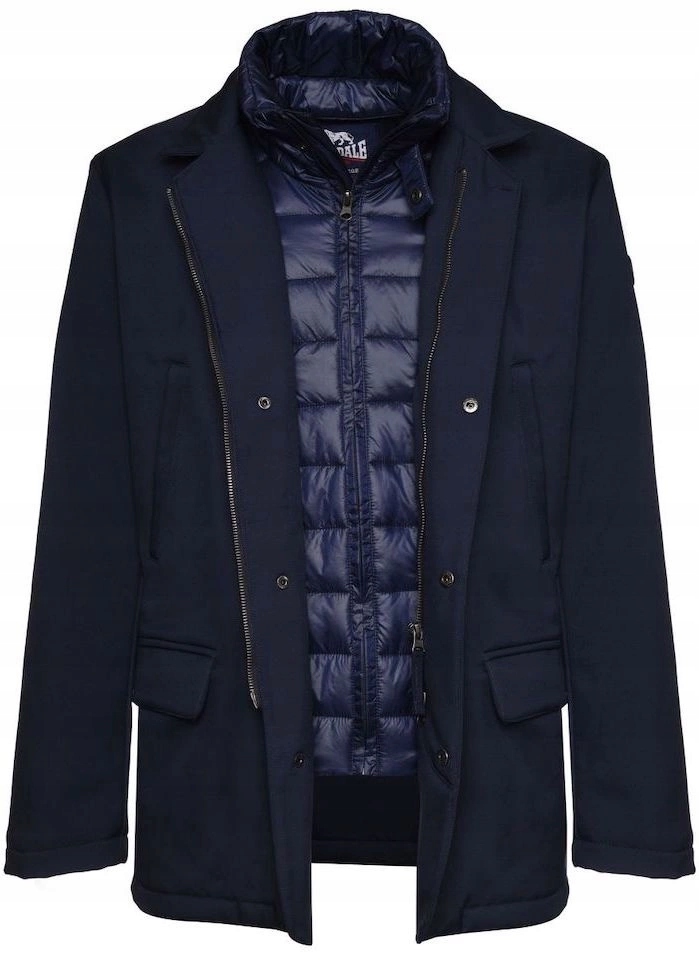 Куртка/пальто Lonsdale Uomo з останньої осінньо-зимової колекції, знизу стьобаний шар, що імітує піджак або безрукавку, що стирчить з-під пальто.
