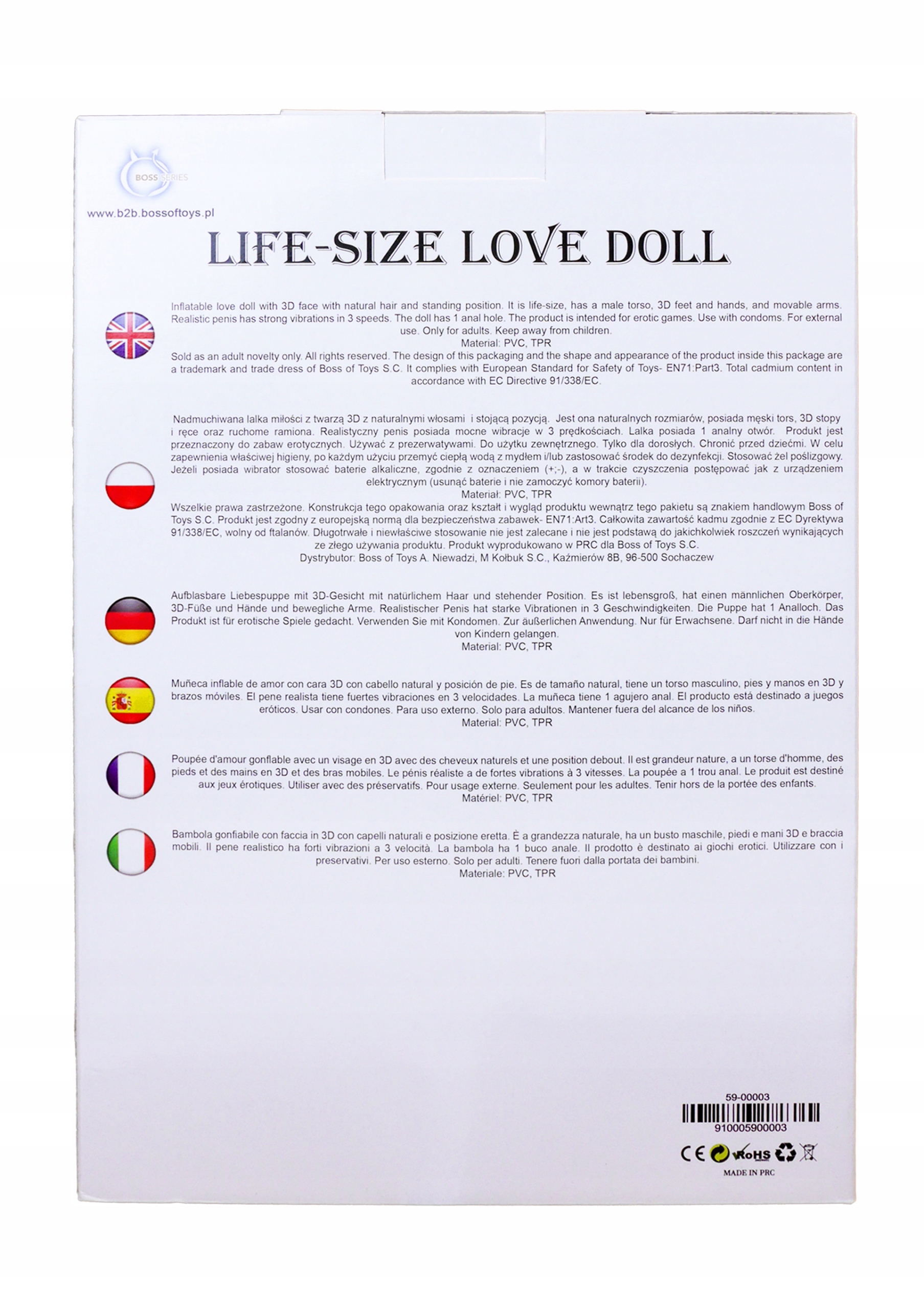Надувна лялька кохання з 3D обличчям з натуральним волоссям і положенням стоячи. Він у натуральну величину, має чоловічий торс, тривимірні стопи та руки, а також рухомі руки. Реалістичний пеніс має потужні вібрації на трьох швидкостях. Лялька має 1 анальний отвір.