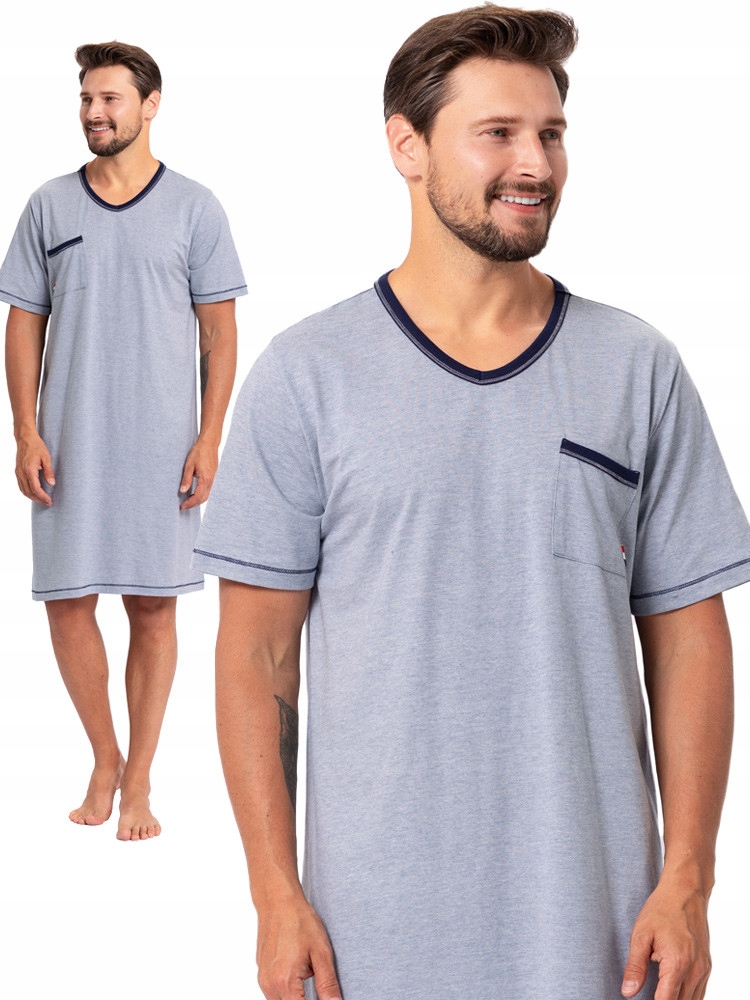 Дуже зручна чоловіча сорочка з V-подібним вирізом і короткими рукавами. Використання благородної тканини «nerve» робить його надзвичайно зручним і приємним на дотик, а засинати в ньому стає суцільним задоволенням. Високу якість сорочки підкреслює V-подібний виріз, оброблений контрастною окантовкою, рукава і низ сорочки оброблені рівноконтрастними нитками, а практична кишеня прикрашена витонченим елементом у вигляді різнокольорової стрічки. Розрізи з боків сорочки забезпечують необмежений рух.