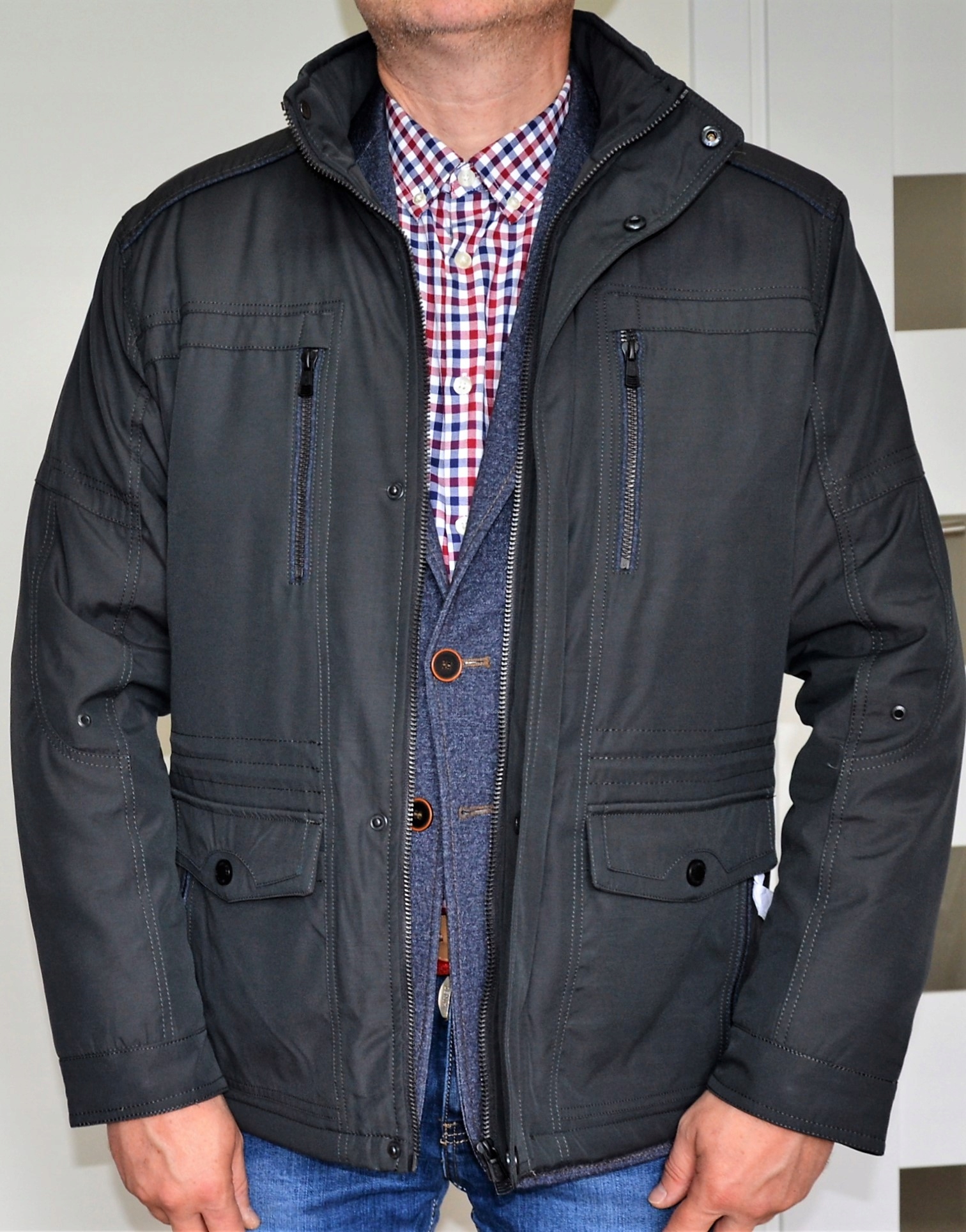 Довжина куртки вимірюється по спині від стійки- підйомний комір 75