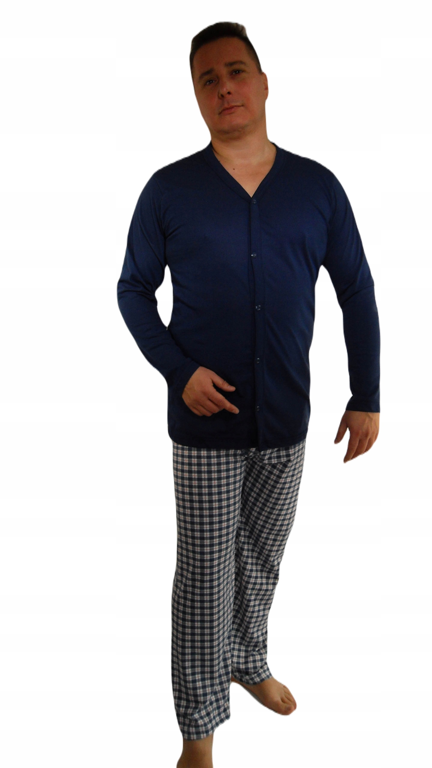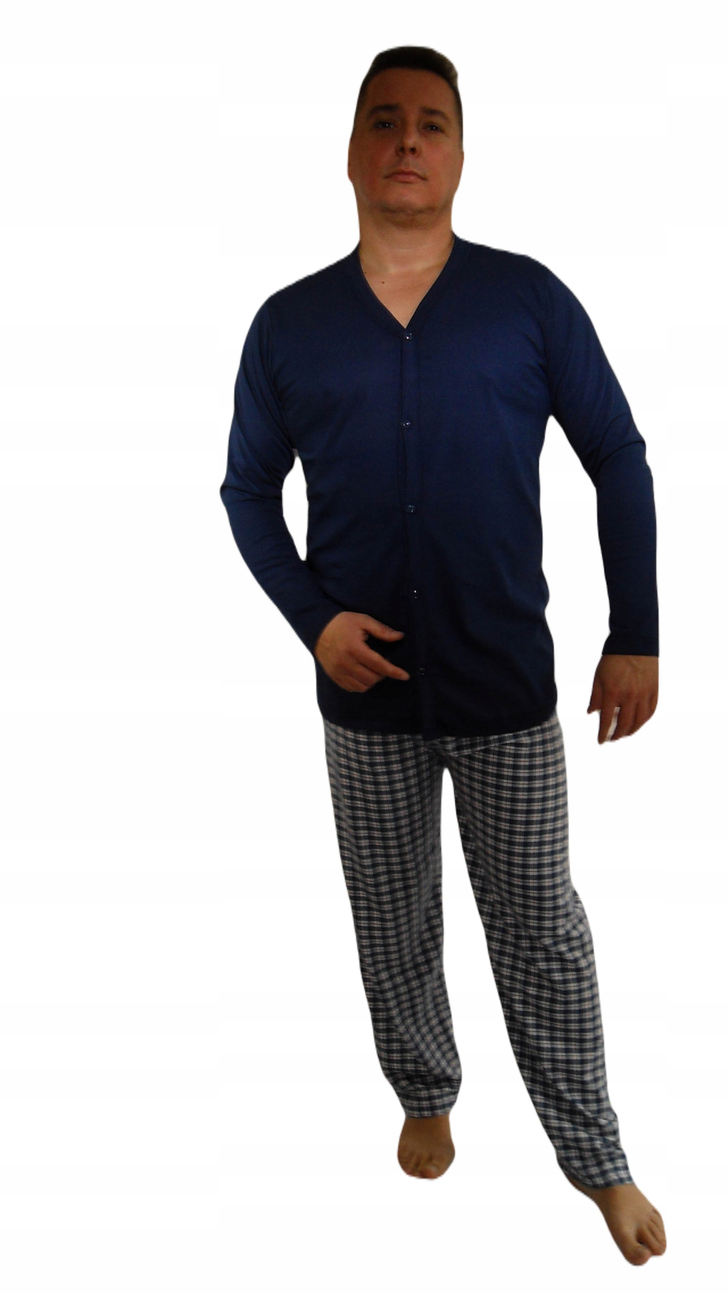 Бавовняна піжама, що складається з сорочки з довгими рукавами, що застібається на гудзики. У комплект входять довгі штани з не стягуючим еластичним поясом.