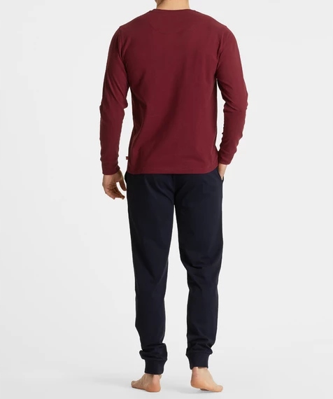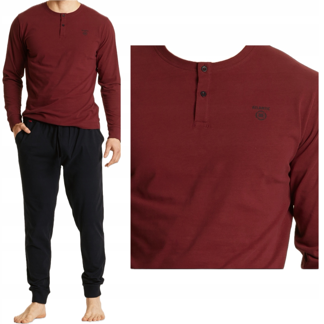 Чоловіча піжама - комплект: футболка з довгим рукавом винно-червоного кольору і довгі темно-сині штани. Вільні та надзвичайно зручні штани з прямими штанинами та манжетами внизу. Вони також мають практичні кишені з боків і зав'язуються на талії. Футболка з круглим вирізом, застібається на два гудзики, праворуч непомітний логотип Atlantic в колір виробу. Піжама виготовлена з приємного на дотик бавовни, збагаченого «ефектом персика». Таким чином, тканина вкрита крихітними пухнастими волосками, які на дотик нагадують шкірку персика.