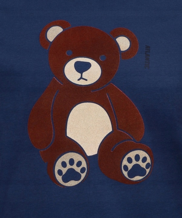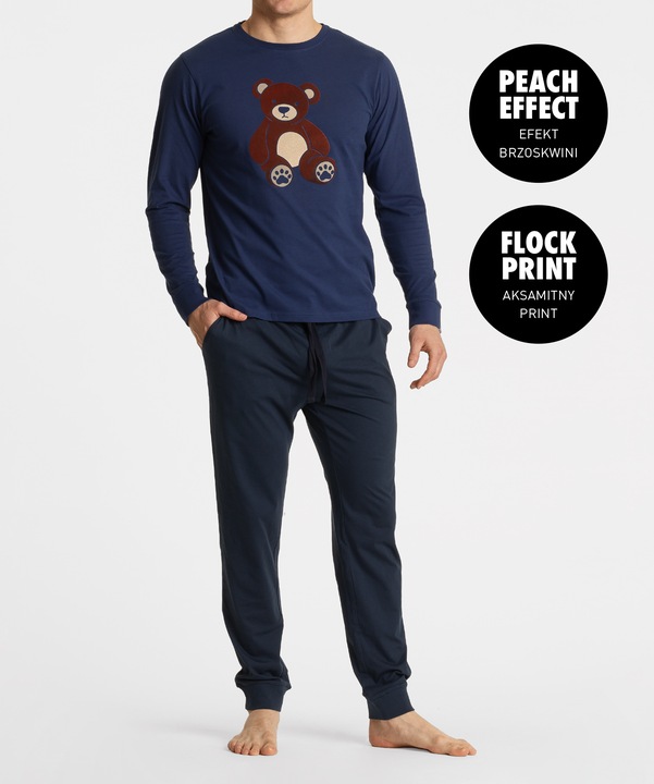 Піжама-двійка з високоякісної тканини «peach effect», тобто ефект замшевої персикової шкіри на дотик. Верх піжами ніжно прилягає до тіла з великим мотивом плюшевого ведмедика. Вільні брюки з кишенями і зав'язкою на талії. Оздоблення штанин манжетами.