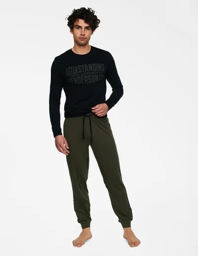 Чоловіча піжама з двох частин HENDERSON BADGE складається з двох елементів: гладких довгих штанів і гладкої футболки з довгими рукавами та круглим вирізом. Елегантне тиснення з логотипом бренду на грудях. Прямі брюки мають манжети на щиколотках. Широкий еластичний пояс і додаткова зав'язка під колір верху піжами дають можливість регулювати окружність. Спальний комплект з високоякісної бавовни, що забезпечує найкращий комфорт під час сну.