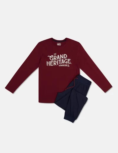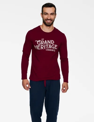 Чоловіча піжама-двійка бренду HENDERSON червоного кольору - це зручний спальний комплект, який складається з вільної футболки з довгим рукавом і довгих штанів. Верх піжами має круглий неглибокий виріз. Привертає увагу великий напис на висоті грудей. Штани мають еластичний пояс із зав'язками для регулювання окружності. Прямі штанини оброблені широким манжетом, тому вони не згорнуться під час сну. Комплект виготовлений з високоякісної бавовни, що забезпечить комфортне використання та комфортний сон.