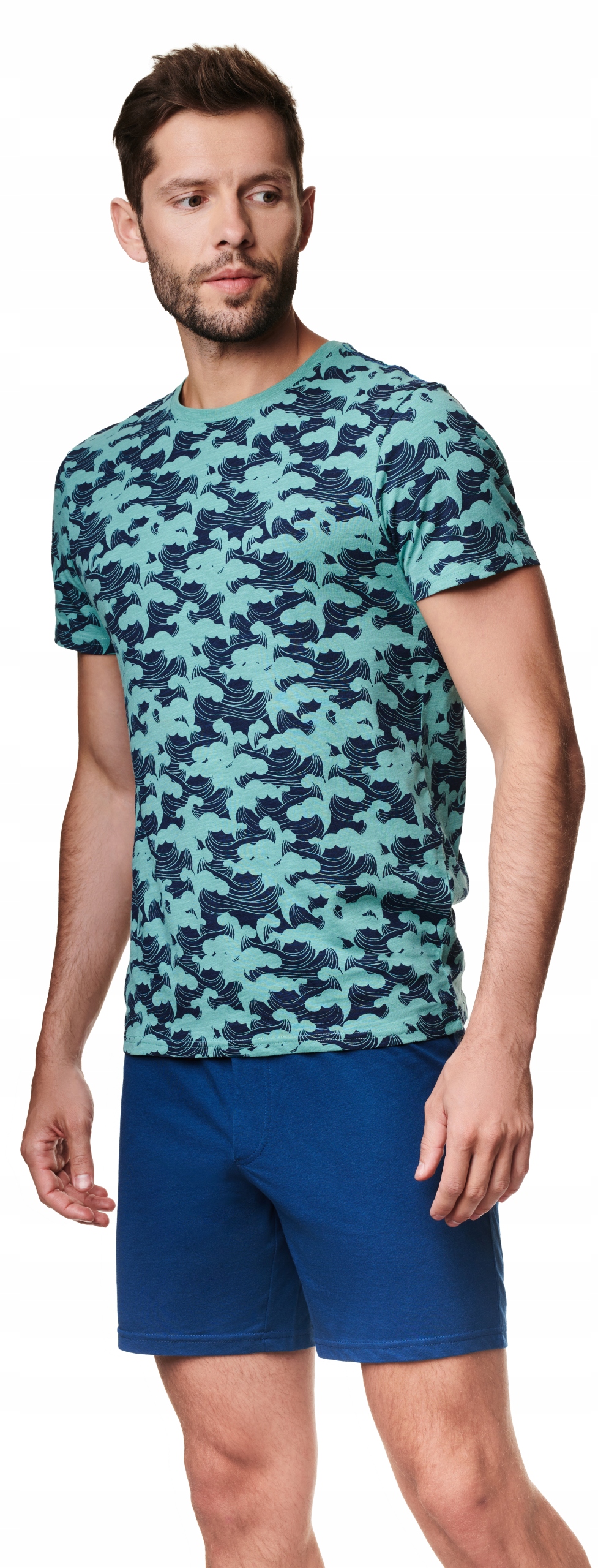 Henderson Aid - це чоловіча піжама з високоякісної 100% бавовни, що гарантує якість і зручність використання, а також комфорт під час сну. Використана бавовна - це м'яка і еластична тканина, яка забезпечує комфорт навіть після тривалого використання, не сковує рухів і не здавлює тіло. Комплект складається із зеленої футболки з цікавим принтом та темно-синіх шортів із зав'язкою на талії.