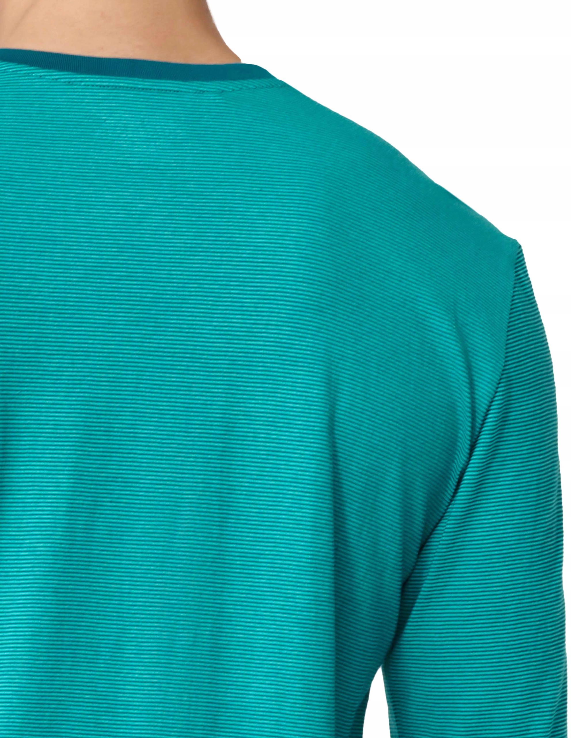 Футболка має класичний V-подібний виріз і довгі рукави. Бірюзова блуза була покрита дрібними смужками.
