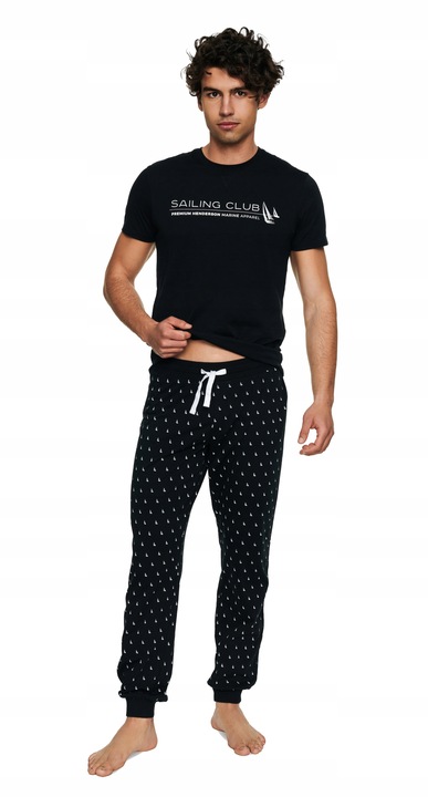 Чоловіча піжама HENDERSON Pirate із двох частин із морським мотивом стане насолодою для любителів вітрильного спорту. Комплект складається з класичної футболки з коротким рукавом і довгих штанів. Верх піжами прикрашений тематичним принтом, а штани піжами прикрашені дрібними принтами-вітрильниками. Прямі довгі штанини оброблені манжетами, завдяки чому штани не задираються під час сну. Піжами з м’якої бавовни підійдуть як вдома, так і в подорожах.