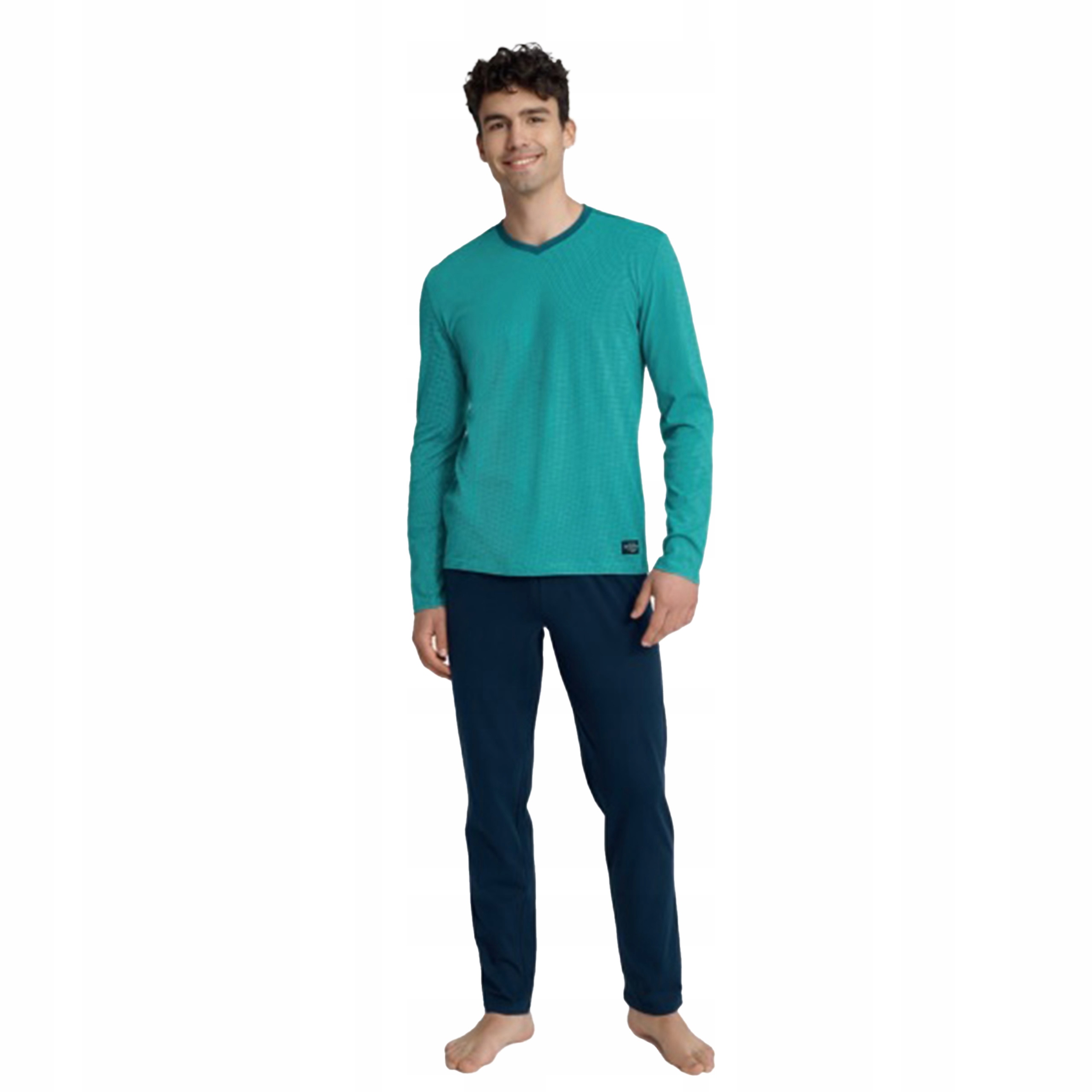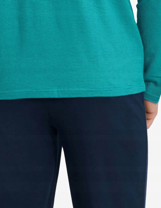 Чоловіча піжама-двійка HENDERSON UDOS - це зручний спальний комплект, який складається з вільної футболки з довгим рукавом і довгих штанів. Верх піжами має круглий неглибокий виріз і ніжний смугастий матеріал. Однотонні штани мають еластичний пояс із зав'язками для регулювання окружності. Прямі ноги, щоб вони не згорталися під час сну. Комплект виготовлений з якісної бавовни, що забезпечить комфортне використання та комфортний сон.